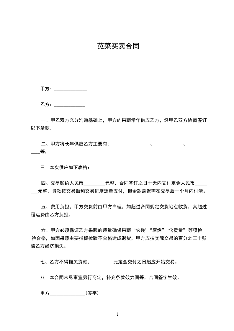 一、甲乙双方充分沟通基础上,甲方的果蔬常年供应乙方,经甲乙双方协商签订以下条款: