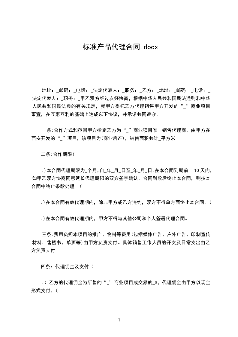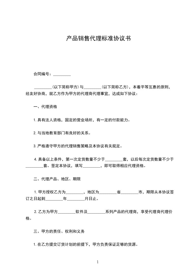 8.本协议未尽事宜,经甲乙双方协商另行签订补充协议规定,补充协议与本协议具有同等的法律效力。 甲方(盖章):_________ 乙方(盖章):_________ 授权代表(签字):_________ 授权代表(签字):_________ 地址:_________ 地址:_________ 邮编:_________ 邮编:_________ 电话:_________ 电话:_________ 传真:_________ 传真:_________ 开户行:_________ 开户行:_________ 帐号:_________ 帐号:_________ ________年____月____日 ________年____月____日 标准产品代理合同模板【2】 合同编号:_________ 签约地点:__________________ 签约时间:__________________ 甲方:______________________ 地址:______________________ 法定代表人: _______________ 乙方:______________________ 地址:______________________ 法定代表人:________________ 甲乙双方本着平等互利,协商一致的原则,就甲方委托乙方在指定区域代理销售甲方产品的有关事宜,达成如下协议: