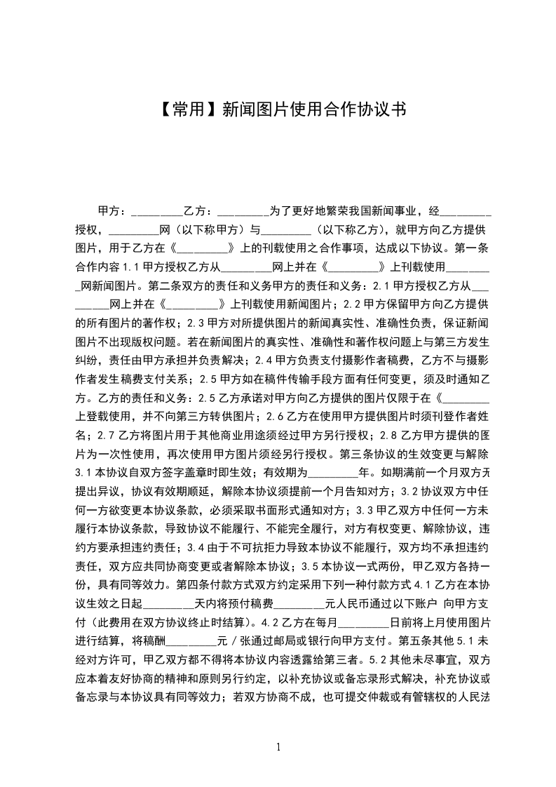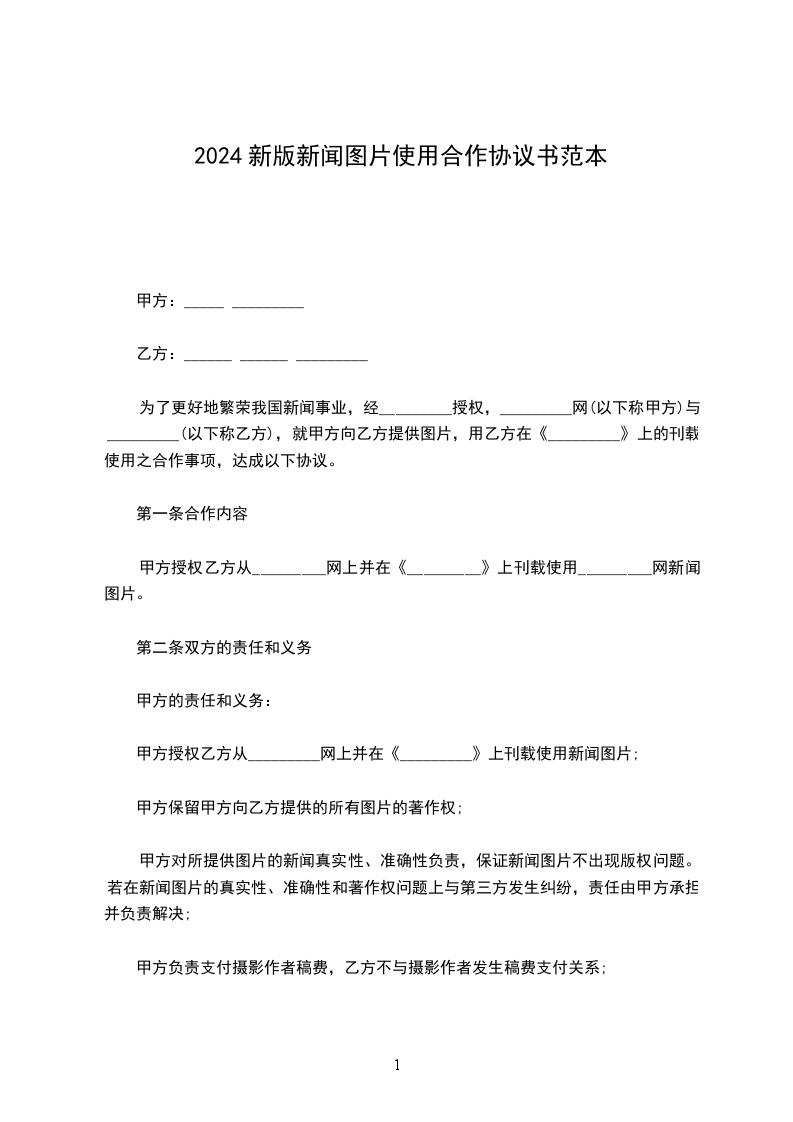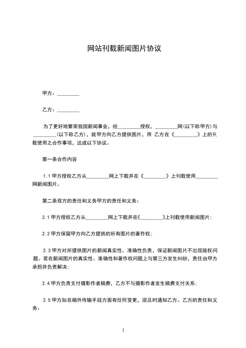 甲方:_________乙方:_________为了更好地繁荣我国新闻事业,经_________授权,_________网(以下称甲方)与_________(以下称乙方),就甲方向乙方提供图片,用于乙方在《_________》上的刊载使用之合作事项,达成以下协议。