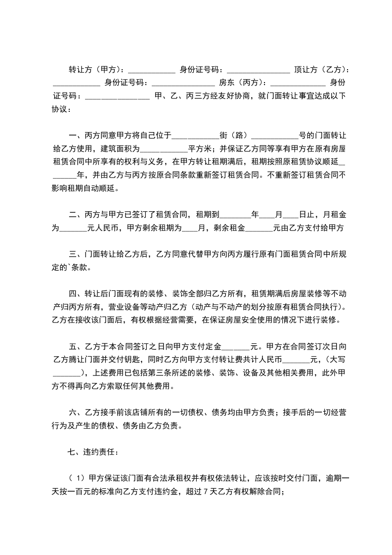 转让方(甲方):____________ 身份证号码:________________ 顶让方(乙方):____________ 身份证号码:________________ 房东(丙方):______________ 身份证号码:________________ 甲、乙、丙三方经友好协商,就门面转让事宜达成以下协议: