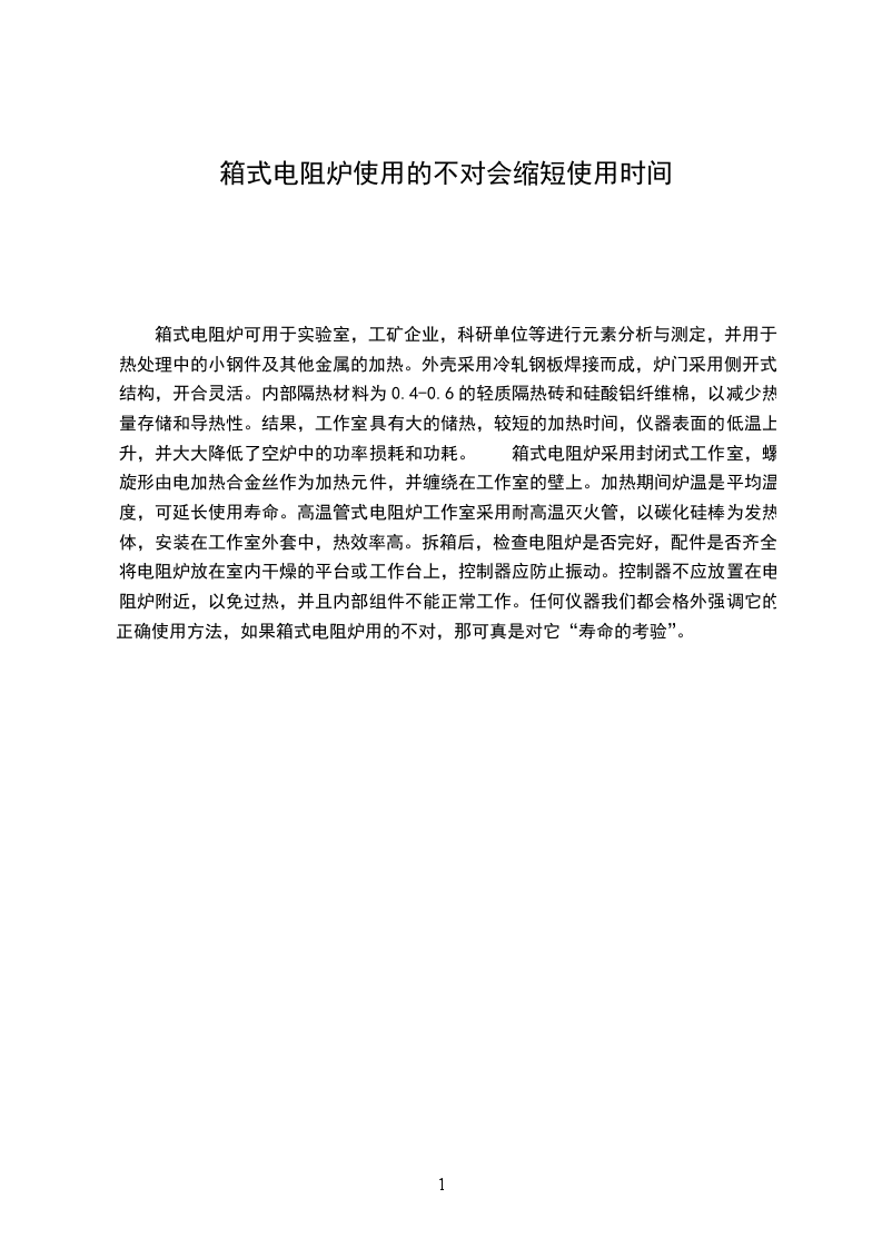 箱式电阻炉可用于实验室,工矿企业,科研单位等进行元素分析与测定,并用于热处理中的小钢件及其他金属的加热。外壳采用冷轧钢板焊接而成,炉门采用侧开式结构,开合灵活。内部隔热材料为0.4-0.6的轻质隔热砖和硅酸铝纤维棉,以减少热量存储和导热性。结果,工作室具有大的储热,较短的加热时间,仪器表面的低温上升,并大大降低了空炉中的功率损耗和功耗。 箱式电阻炉采用封闭式工作室,螺旋形由电加热合金丝作为加热元件,并缠绕在工作室的壁上。加热期间炉温是平均温度,可延长使用寿命。高温管式电阻炉工作室采用耐高温灭火管,以碳化硅棒为发热体,安装在工作室外套中,热效率高。拆箱后,检查电阻炉是否完好,配件是否齐全。将电阻炉放在室内干燥的平台或工作台上,控制器应防止振动。控制器不应放置在电阻炉附近,以免过热,并且内部组件不能正常工作。任何仪器我们都会格外强调它的正确使用方法,如果箱式电阻炉用的不对,那可真是对它“寿命的考验”。
