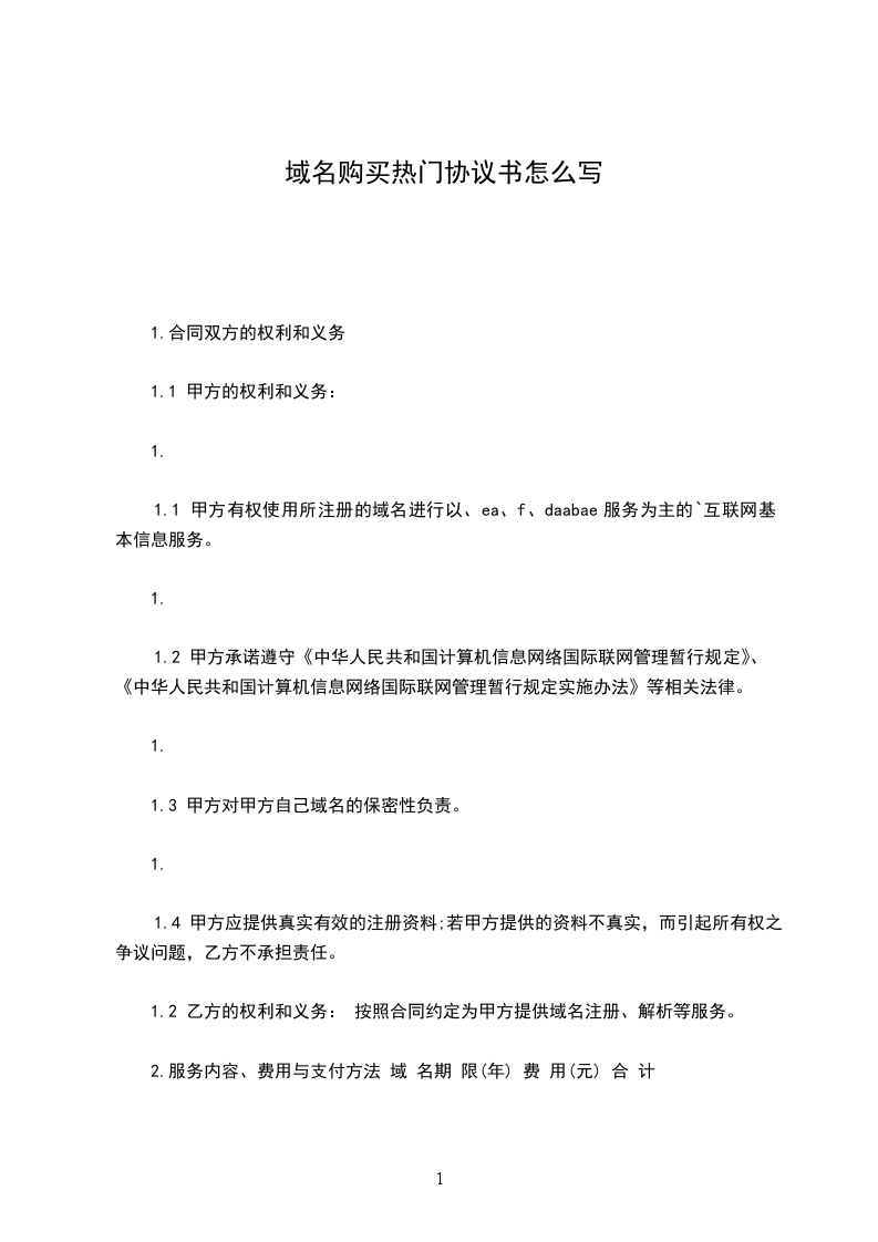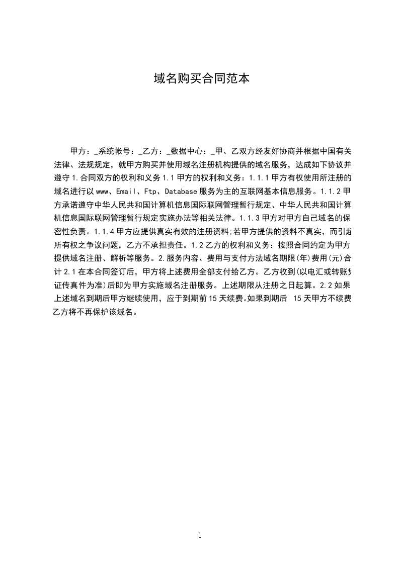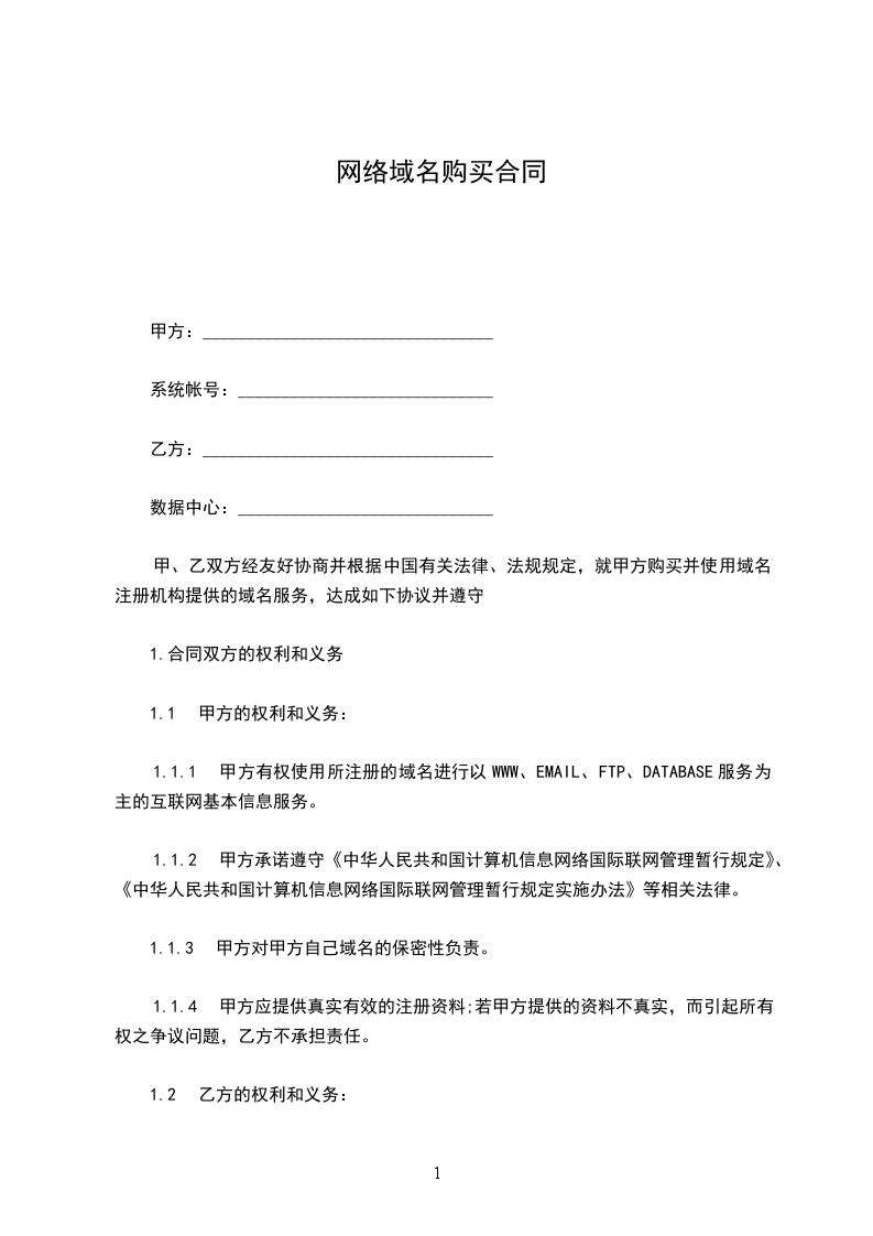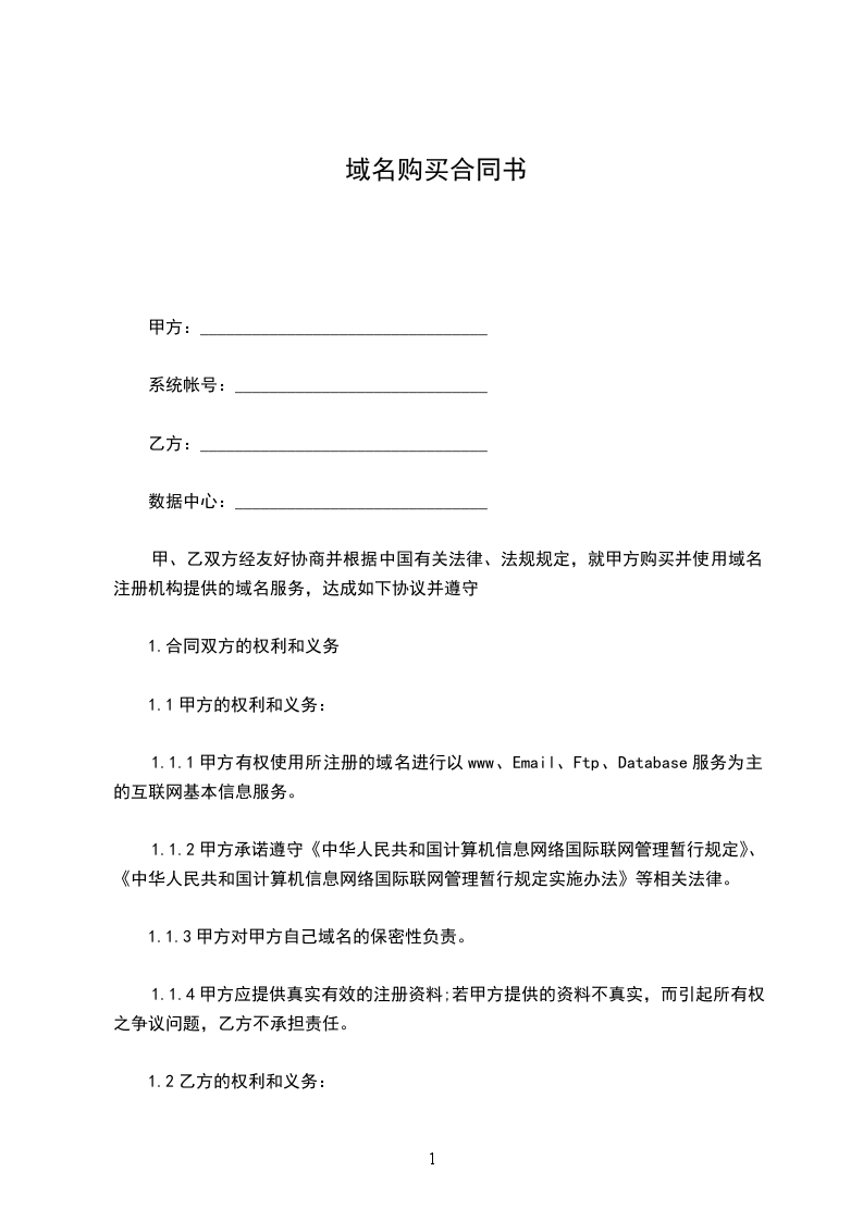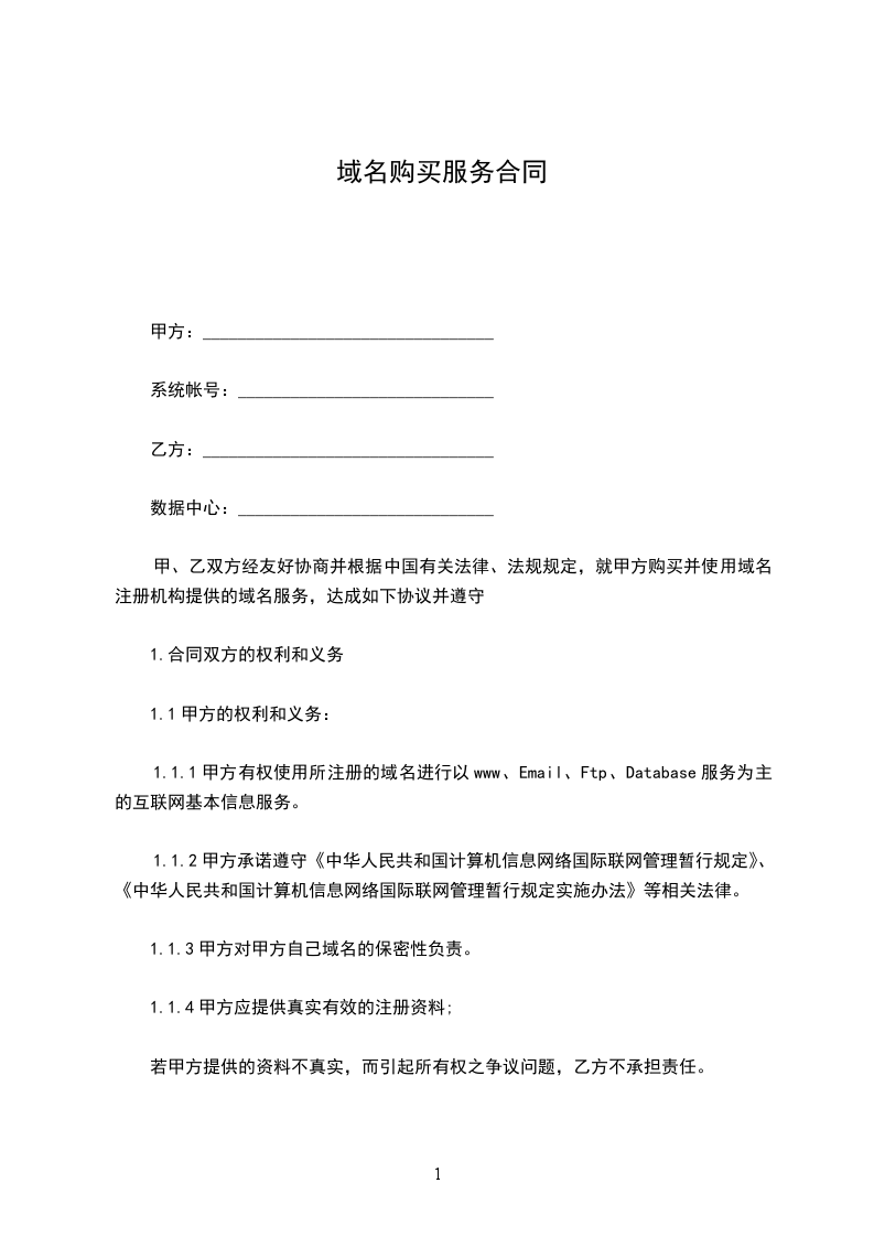 甲方:_________________________________ 系统帐号:_____________________________ 乙方:_________________________________ 数据中心:_____________________________ 甲、乙双方经友好协商并根据中国有关法律、法规规定,就甲方购买并使用域名注册机构提供的域名服务,达成如下协议并遵守
