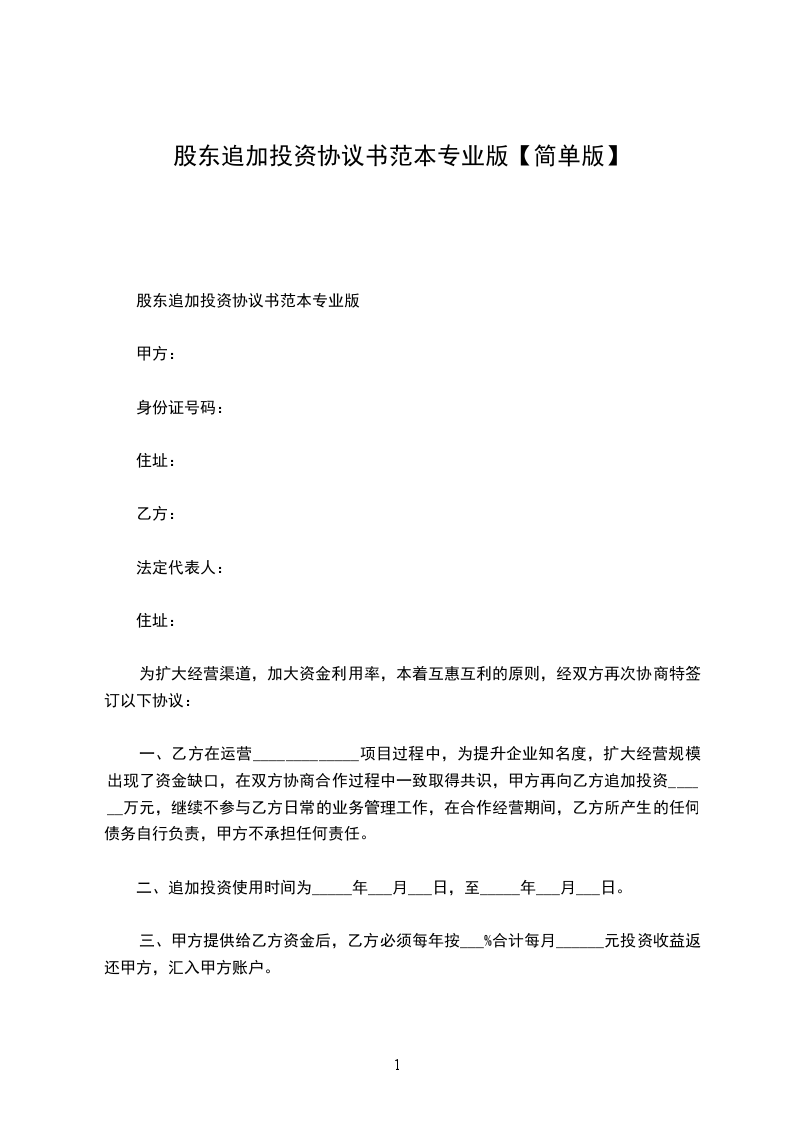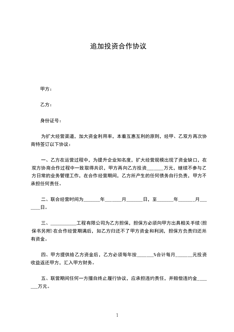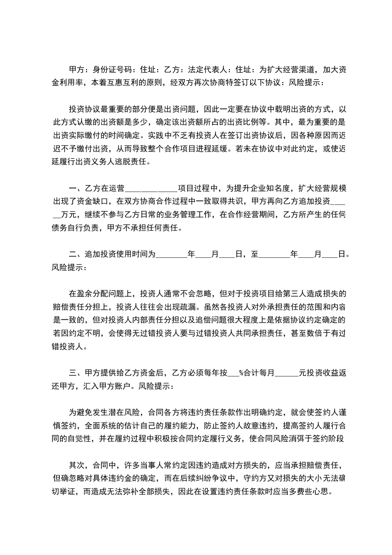 一、乙方在运营_____________项目过程中,为提升企业知名度,扩大经营规模出现了资金缺口,在双方协商合作过程中一致取得共识,甲方再向乙方追加投资______万元,继续不参与乙方日常的业务管理工作,在合作经营期间,乙方所产生的任何债务自行负责,甲方不承担任何责任。