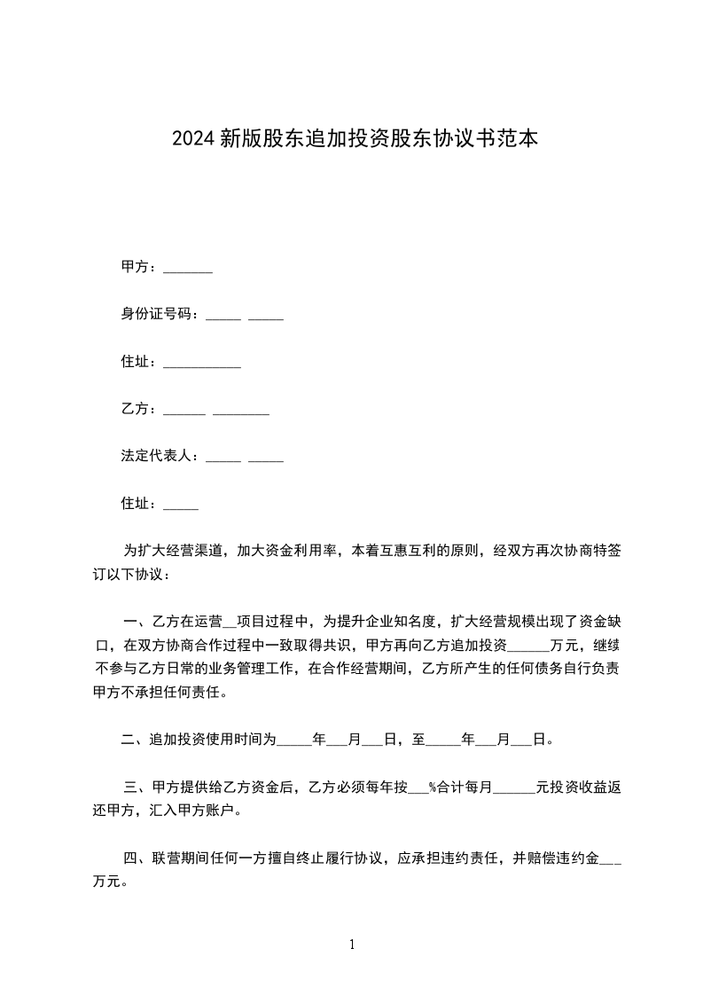 甲方:身份证号码:住址:乙方:法定代表人:住址:为扩大经营渠道,加大资金利用率,本着互惠互利的原则,经双方再次协商特签订以下协议:风险提示: