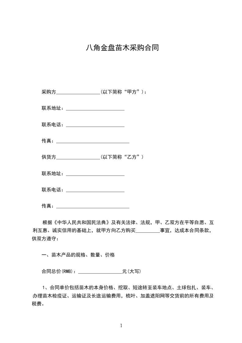 八角金盘苗木采购合同