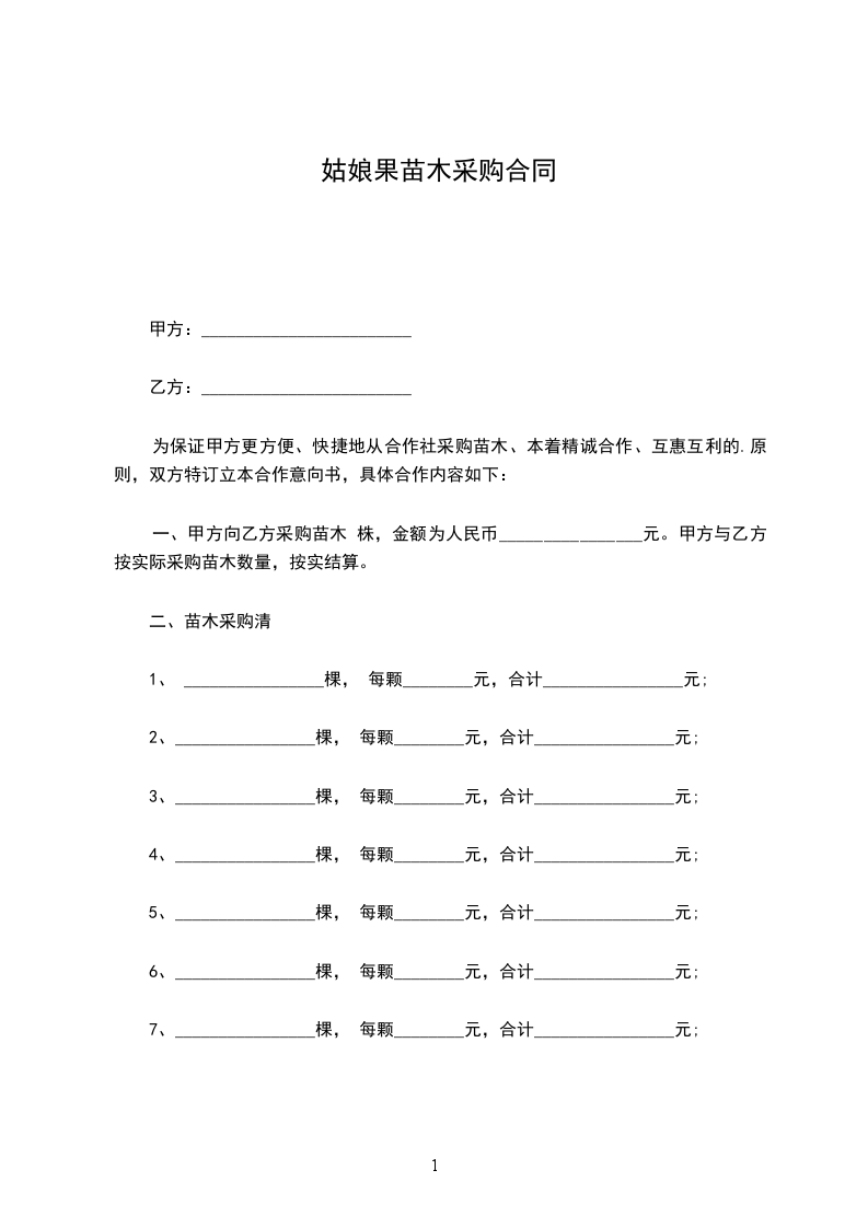 一、甲方向乙方采购苗木 株,金额为人民币________________元。甲方与乙方按实际采购苗木数量,按实结算。