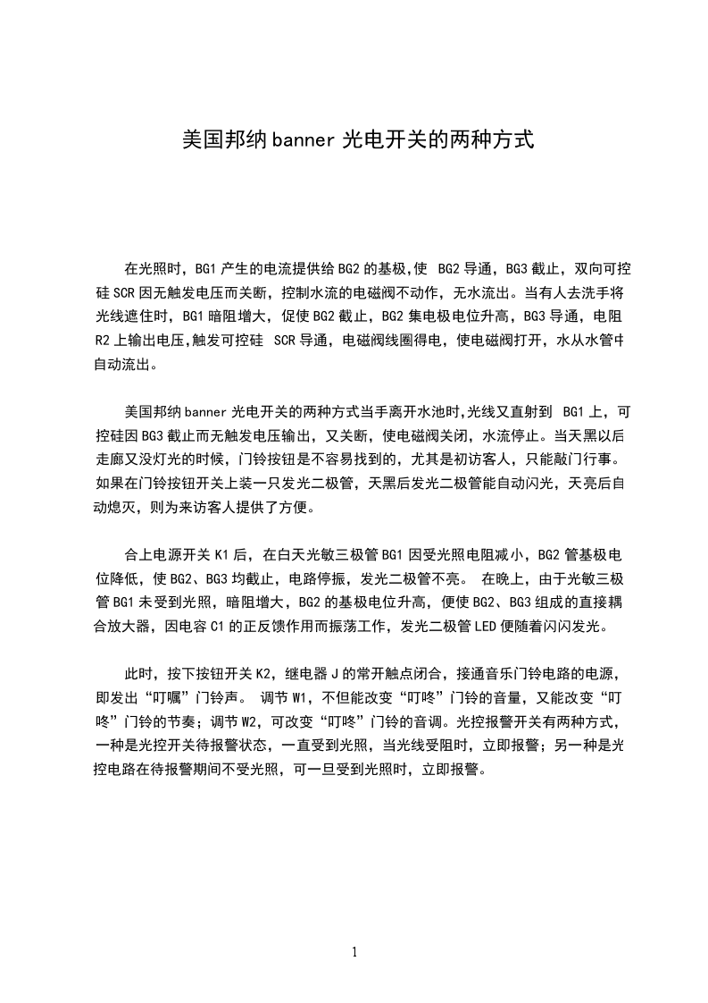美国邦纳banner光电开关的两种方式当手离开水池时,光线又直射到BG1上,可控硅因BG3截止而无触发电压输出,又关断,使电磁阀关闭,水流停止。当天黑以后走廊又没灯光的时候,门铃按钮是不容易找到的,尤其是初访客人,只能敲门行事。如果在门铃按钮开关上装一只发光二极管,天黑后发光二极管能自动闪光,天亮后自动熄灭,则为来访客人提供了方便。