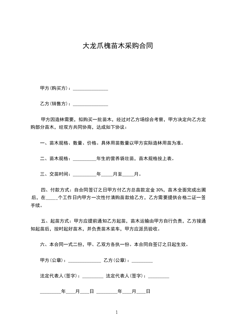 四、付款方式:自合同签订之日甲方付乙方总苗款定金30%,苗木全面完成出圃后,在_____个工作日内甲方一次性付清购苗款给乙方,乙方需要提供合格二证一签手续。