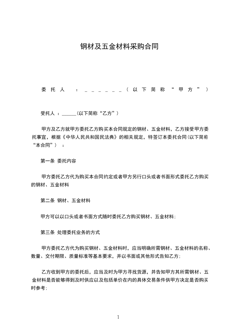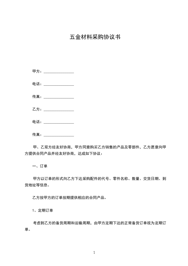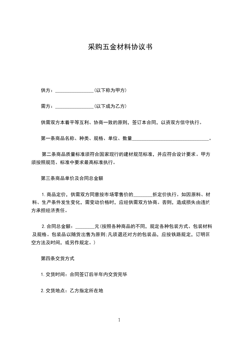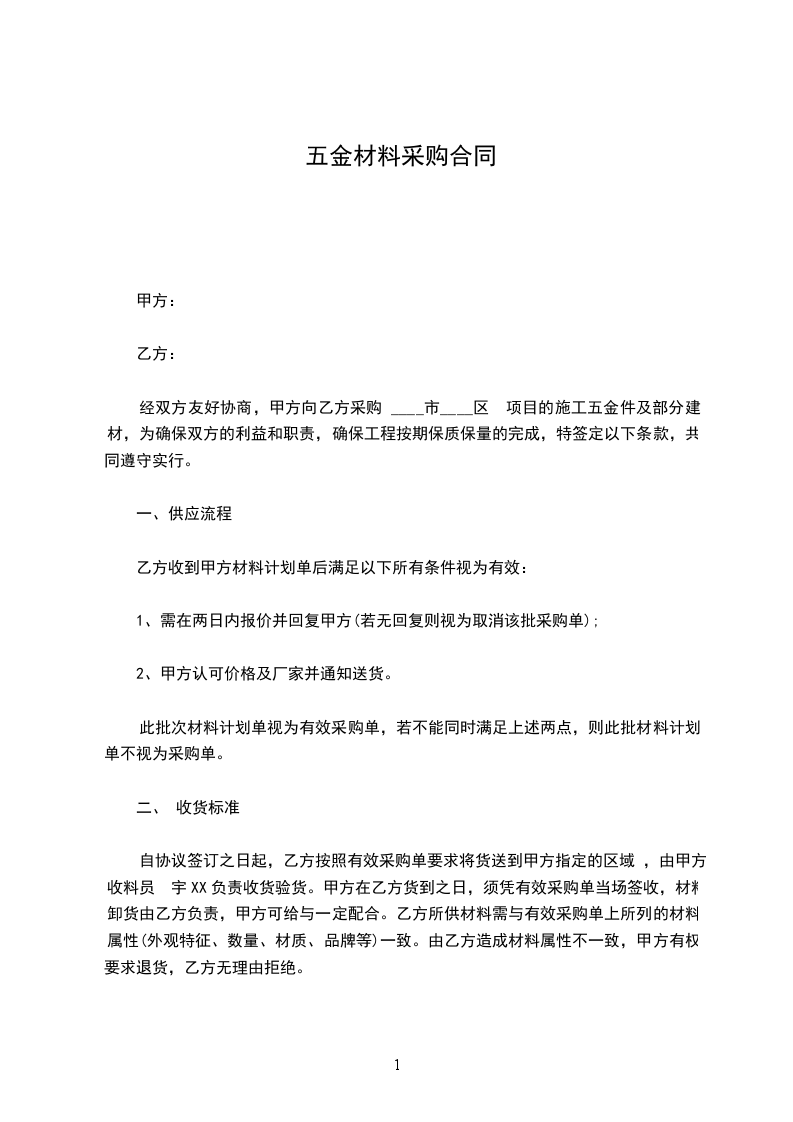 经双方友好协商,甲方向乙方采购 ____市____区 项目的施工五金件及部分建材,为确保双方的利益和职责,确保工程按期保质保量的完成,特签定以下条款,共同遵守实行。