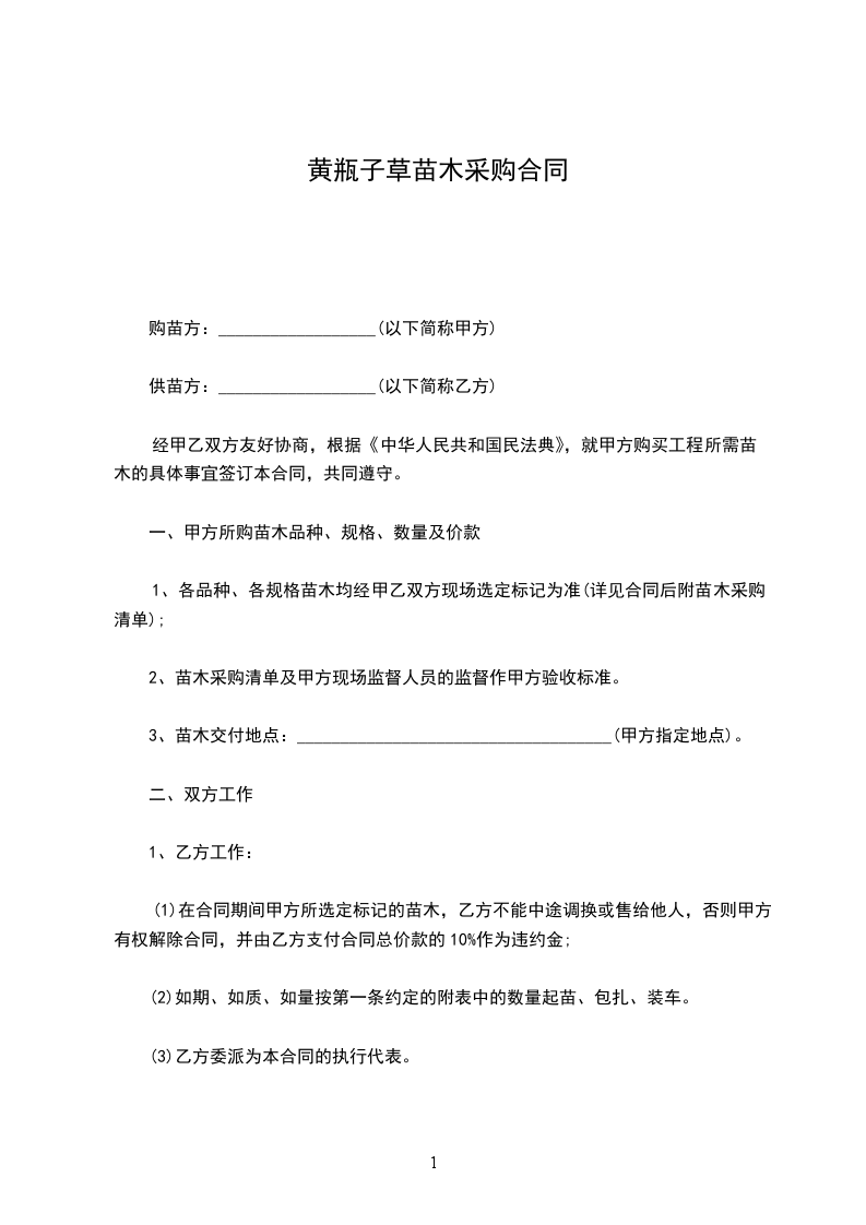 经甲乙双方友好协商,根据《中华人民共和国民法典》,就甲方购买工程所需苗木的具体事宜签订本合同,共同遵守。