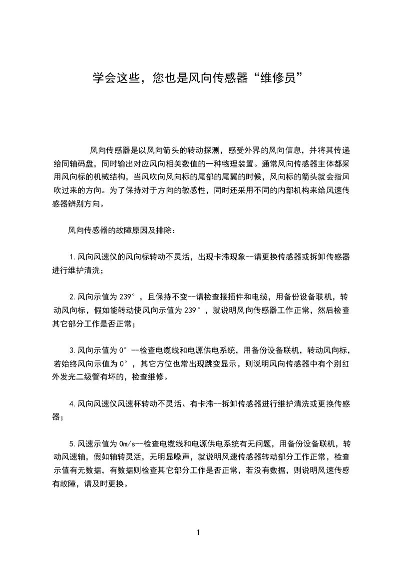 1.风向风速仪的风向标转动不灵活,出现卡滞现象--请更换传感器或拆卸传感器进行维护清洗;