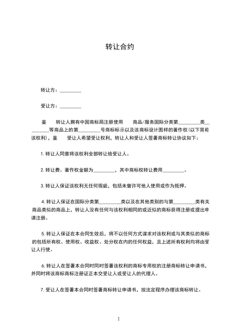 鉴 转让人拥有中国商标局注册使用 商品/服务国际分类第_________类_________等商品上的第_________号商标标示以及该商标设计图样的著作权(以下简称该权利),鉴 受让人希望受让权利,转让人和受让人签署商标转让协议如下: