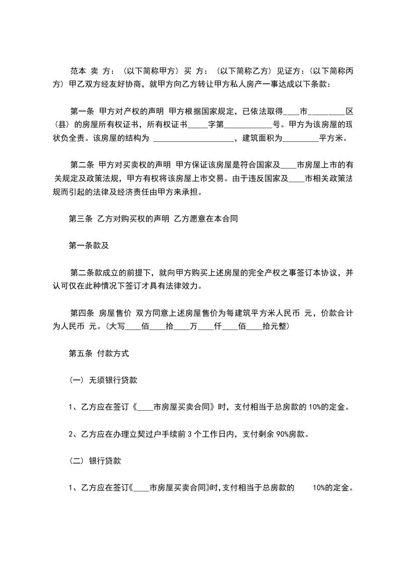 卖 方: (以下简称甲方) 买 方: (以下简称乙方) 见证方: (以下简称丙方) 甲乙双方经友好协商,就甲方向乙方转让甲方私人房产一事达成以下条款: