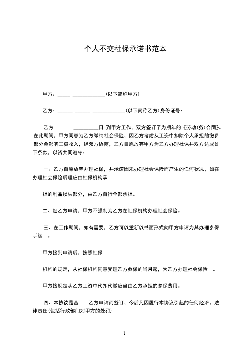 乙方 __________日 到甲方工作,双方签订了为期年的《劳动(务)合同》。在此期间,甲方同意为乙方缴纳社会保险,因乙方考虑从工资中扣除个人承担的缴费部分会影响工资收入,经双方协商,乙方自愿放弃甲方为乙方办理社保并双方达成如下条款,以资共同遵守: