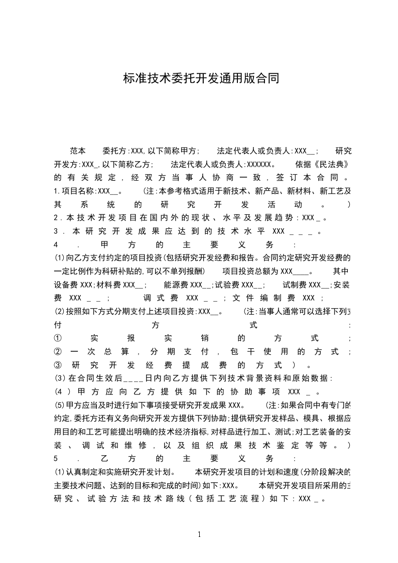 范本 委托方:XXX,以下简称甲方; 法定代表人或负责人:XXX__; 研究开发方:XXX_,以下简称乙方; 法定代表人或负责人:XXXXXX。 依据《民法典》的有关规定,经双方当事人协商一致,签订本合同。