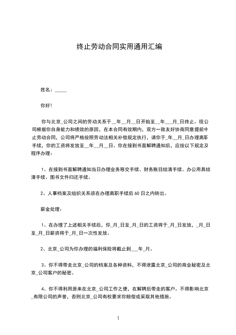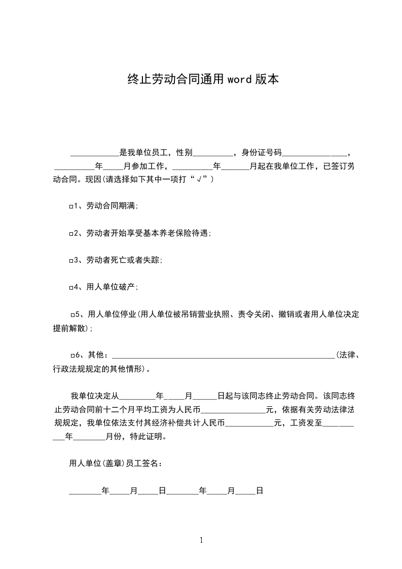 模板 你与我单位订立了 (固定期限、无固定期限、以完成一定工作任务)的劳动合同,合同期内从事 工作。根据《劳动合同法》等有关法律法规的规定,现按下列第 条 款规定解除或终止你与单位的劳动合同(关系):