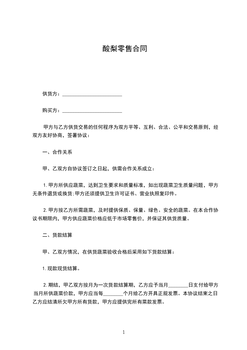 1.甲方所供应蔬菜,达到卫生要求和质量标准,如出现蔬菜卫生质量问题,甲方无条件退货或换货;甲方还须提供卫生许可证书、营业执照复印件。