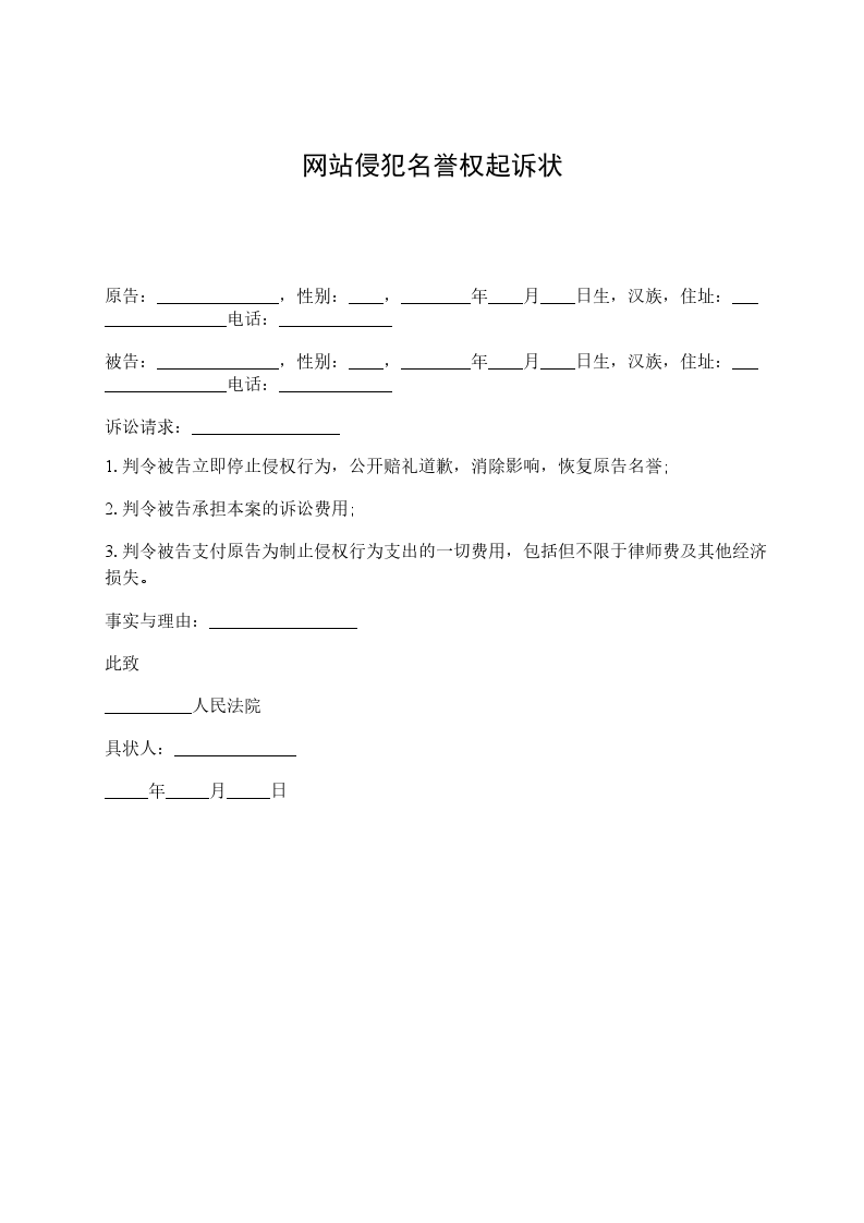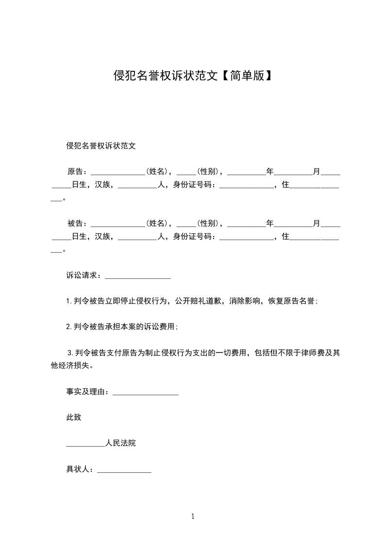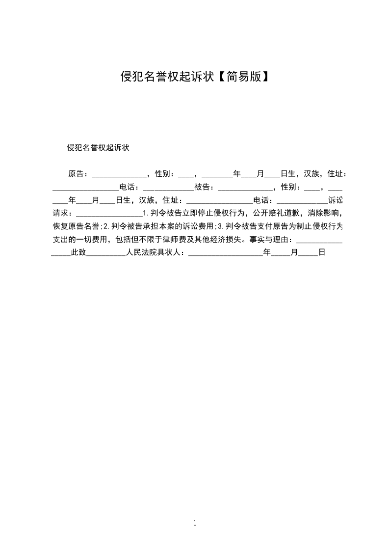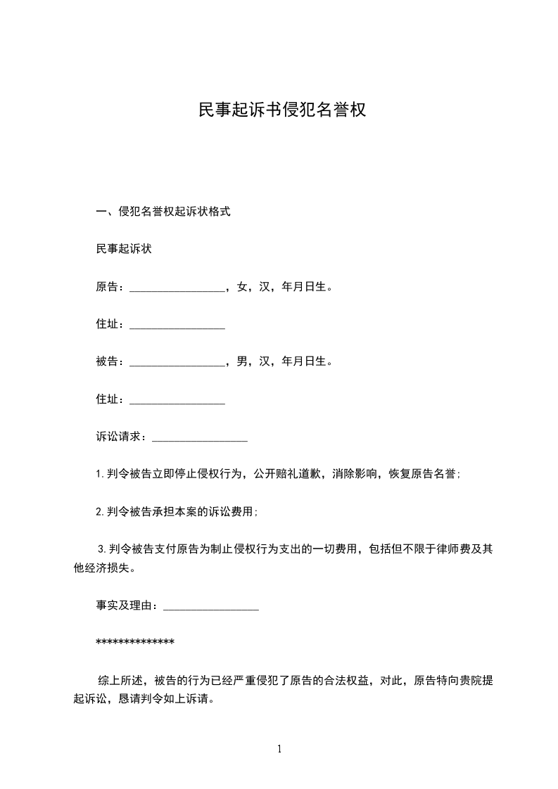 原告:______________(姓名),_____(性别),__________年__________月____________________日 生,汉族,__________人,身份证号码:_____ ______________,住________________。