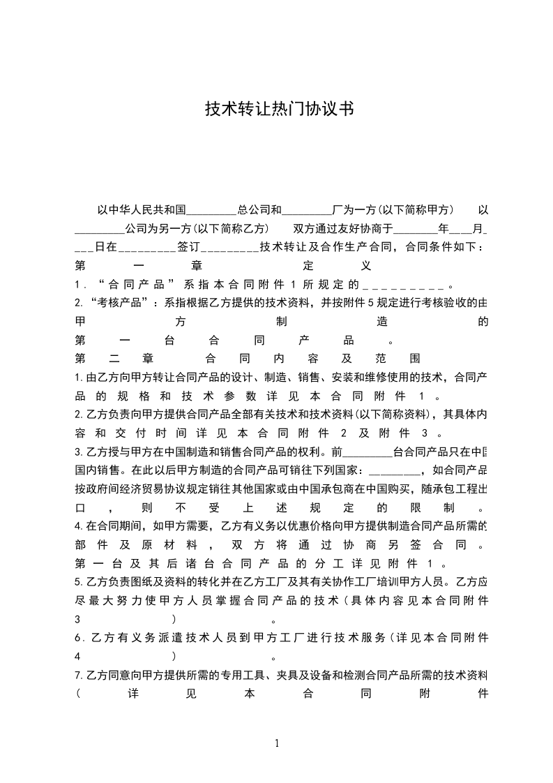 1.由乙方向甲方转让合同产品的设计、制造、销售、安装和维修使用的技术,合同产品的规格和技术参数详见本合同附件1。