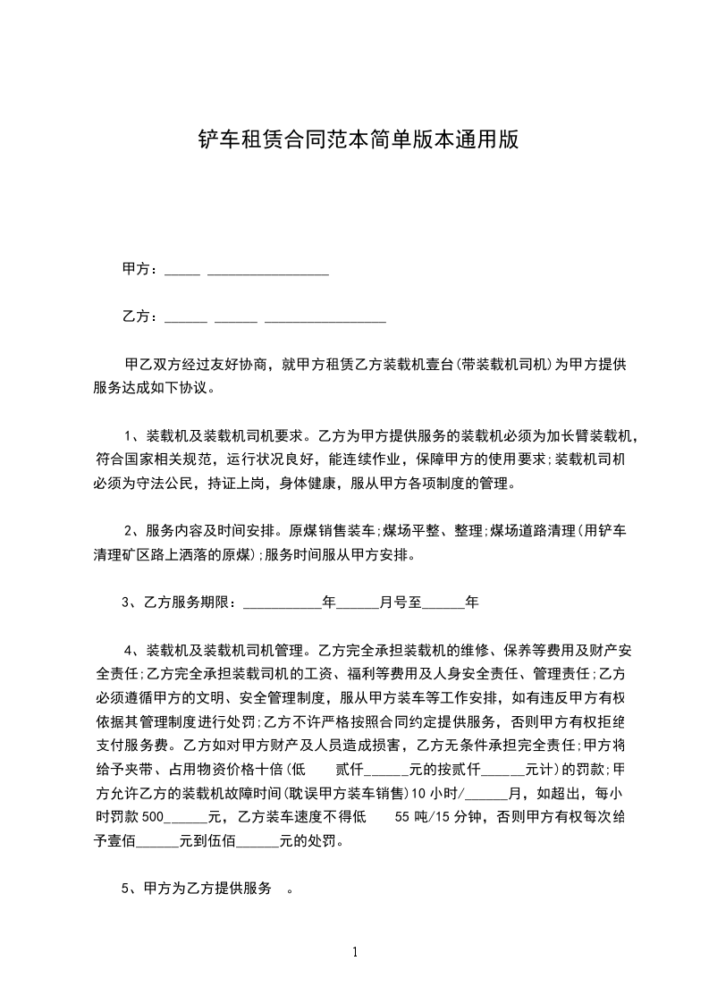 4、装载机及装载机司机管理。乙方完全承担装载机的维修、保养等费用及财产安全责任;乙方完全承担装载司机的工资、福利等费用及人身安全责任、管理责任;乙方必须遵循甲方的文明、安全管理制度,服从甲方装车等工作安排,如有违反甲方有权依据其管理制度进行处罚;乙方不许严格按照合同约定提供服务,否则甲方有权拒绝支付服务费。乙方如对甲方财产及人员造成损害,乙方无条件承担完全责任;甲方将给予夹带、占用物资价格十倍(低 贰仟______元的按贰仟______元计)的罚款;甲方允许乙方的装载机故障时间(耽误甲方装车销售)10小时/______月,如超出,每小时罚款500______元,乙方装车速度不得低 55吨/15分钟,否则甲方有权每次给予壹佰______元到伍佰______元的处罚。