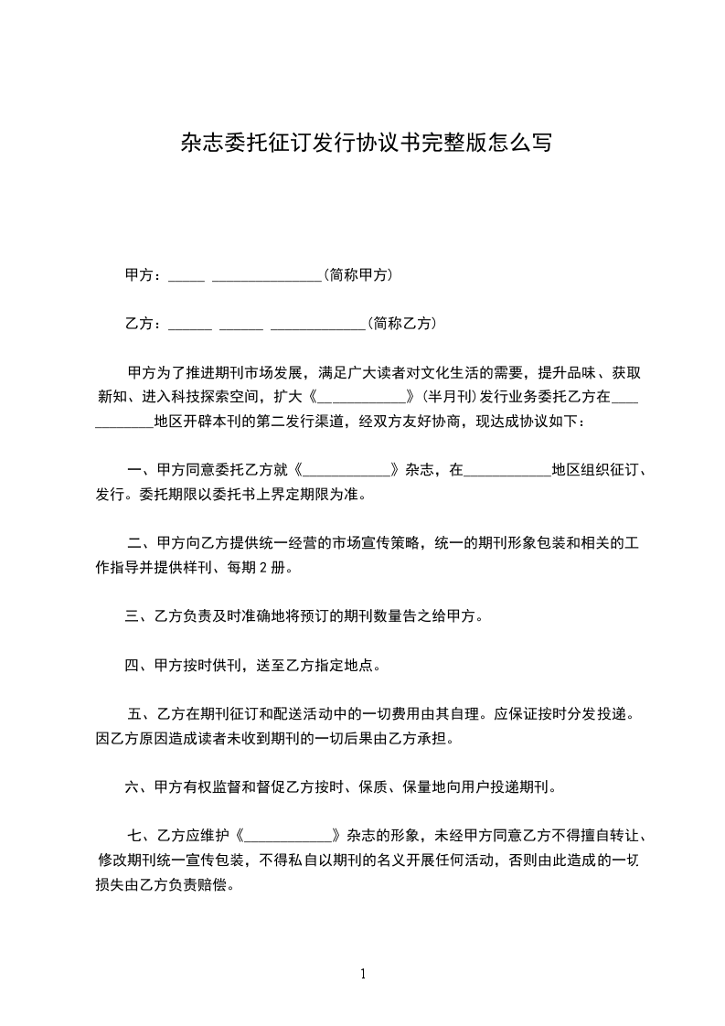 甲方为了推进期刊市场发展,满足广大读者对文化生活的需要,提升品味、获取新知、进入科技探索空间,扩大《____________》(半月刊)发行业务委托乙方在____________地区开辟本刊的第二发行渠道,经双方友好协商,现达成协议如下: