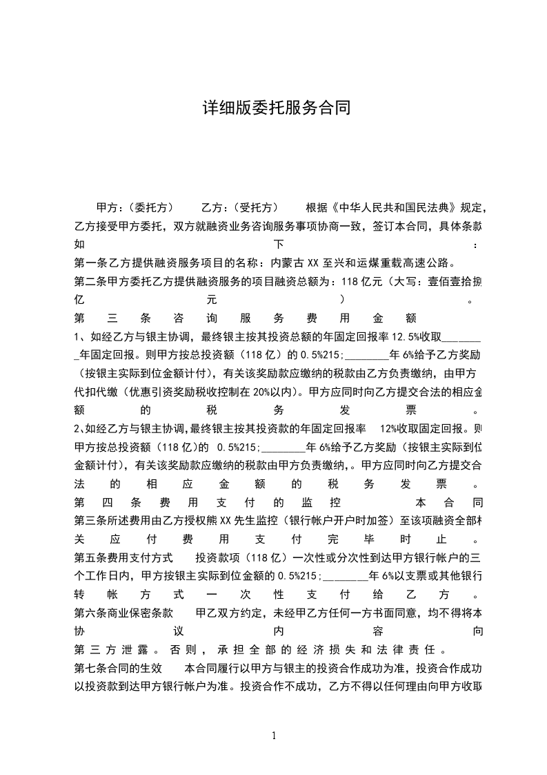 甲方:(委托方) 乙方:(受托方) 根据《中华人民共和国民法典》规定,乙方接受甲方委托,双方就融资业务咨询服务事项协商一致,签订本合同,具体条款如下: