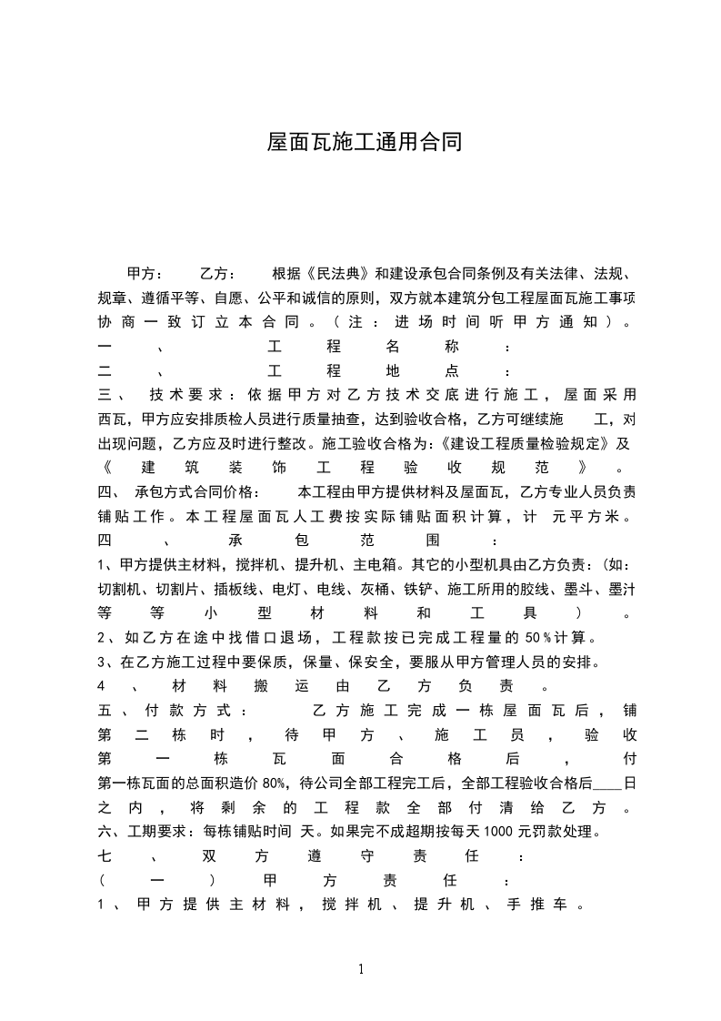 甲方: 乙方: 根据《民法典》和建设承包合同条例及有关法律、法规、规章、遵循平等、自愿、公平和诚信的原则,双方就本建筑分包工程屋面瓦施工事项协商一致订立本合同。(注:进场时间听甲方通知)。