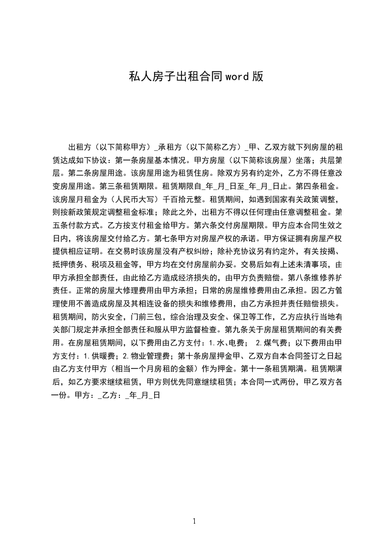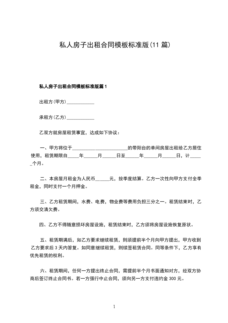 1、若甲方在乙方没有违反本合同的情况下提前解除合同或租给他人,视为甲方违约,负责赔偿违约金_______元。