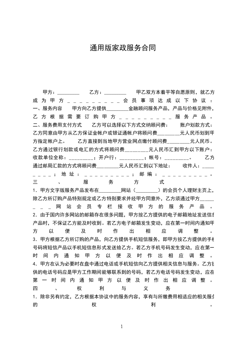 一、服务内容 甲方向乙方提供_________金融顾问服务产品,产品与价格见附件,乙方根据需要订购甲方_________服务产品。