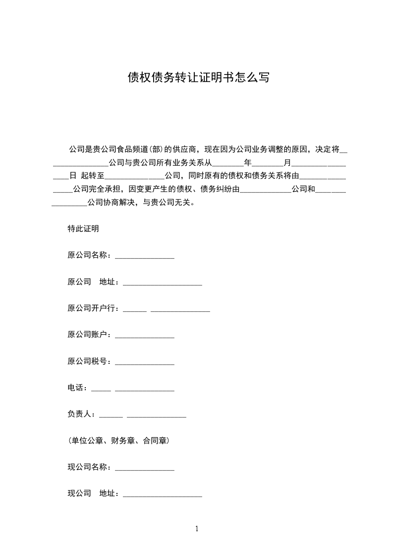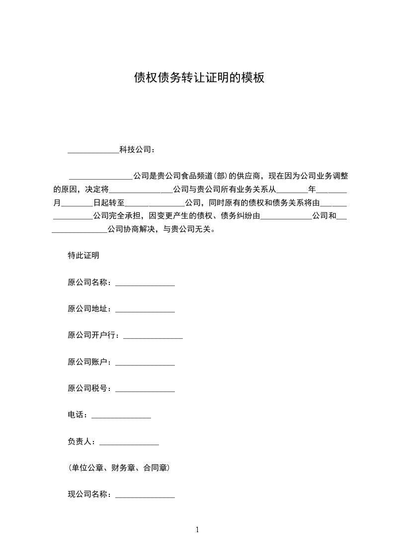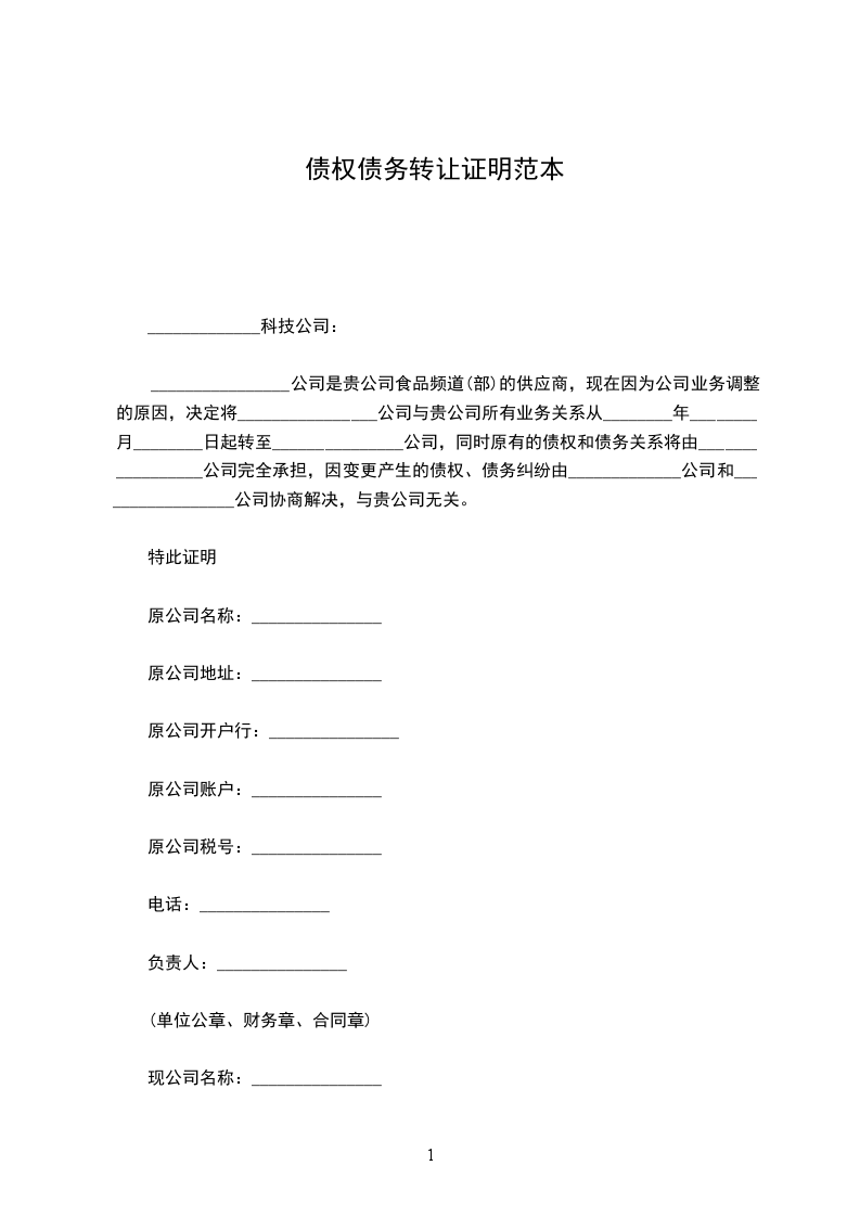 公司是贵公司食品频道(部)的供应商,现在因为公司业务调整的原因,决定将________________公司与贵公司所有业务关系从________年________月__________________日 起转至_______________公司,同时原有的债权和债务关系将由_________________公司完全承担,因变更产生的债权、债务纠纷由_____________公司和_________________公司协商解决,与贵公司无关。