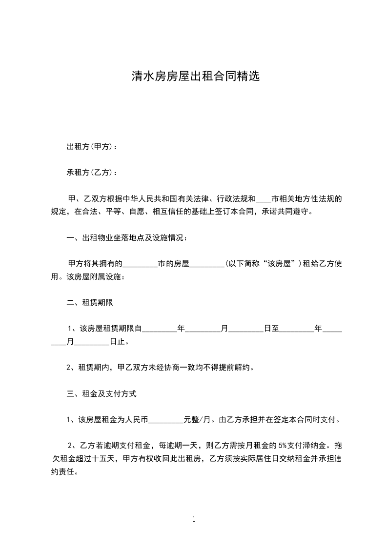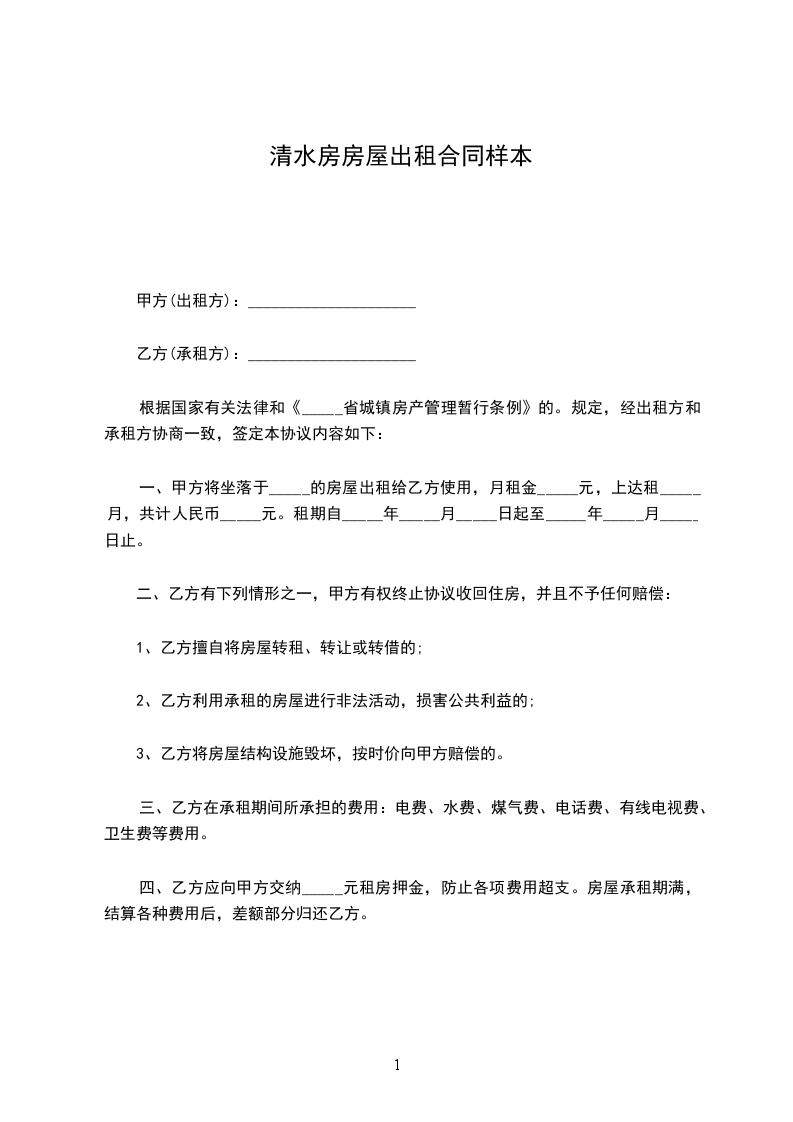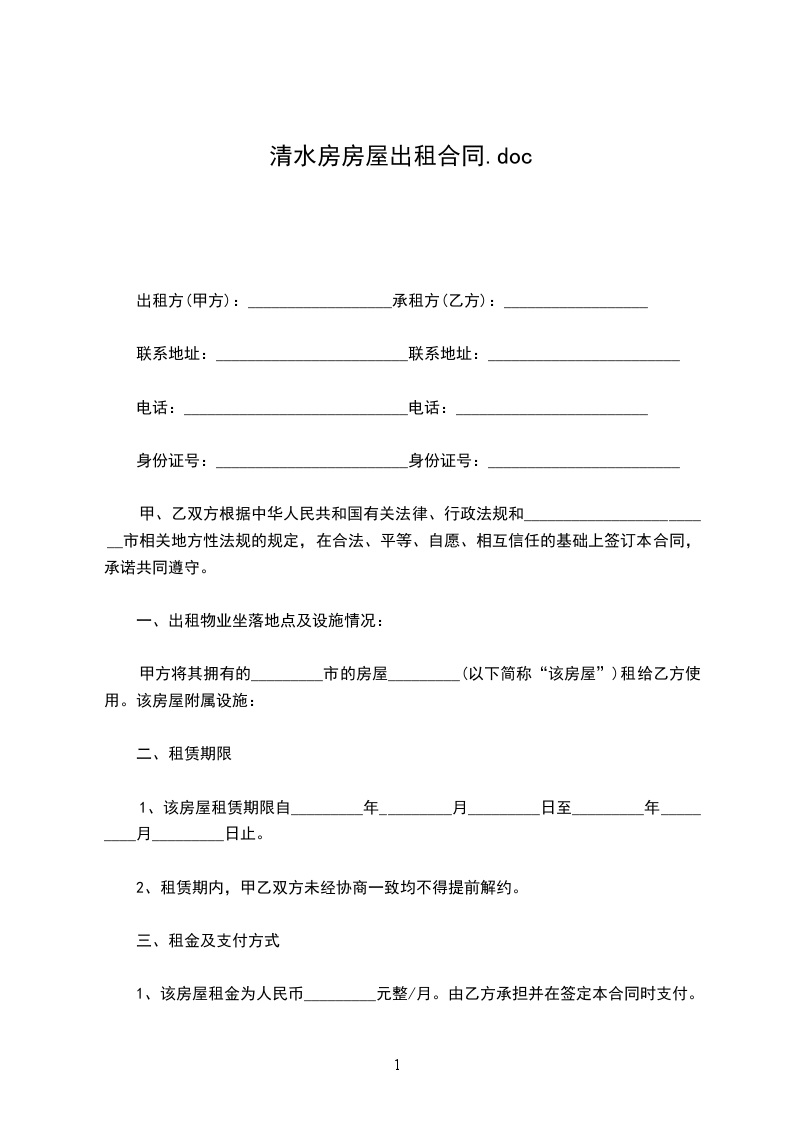 一、出租人愿意将座落在_________市_________区_________号的房子给承租人使用,承租人对此房屋现状已作充分了解,自愿租用。