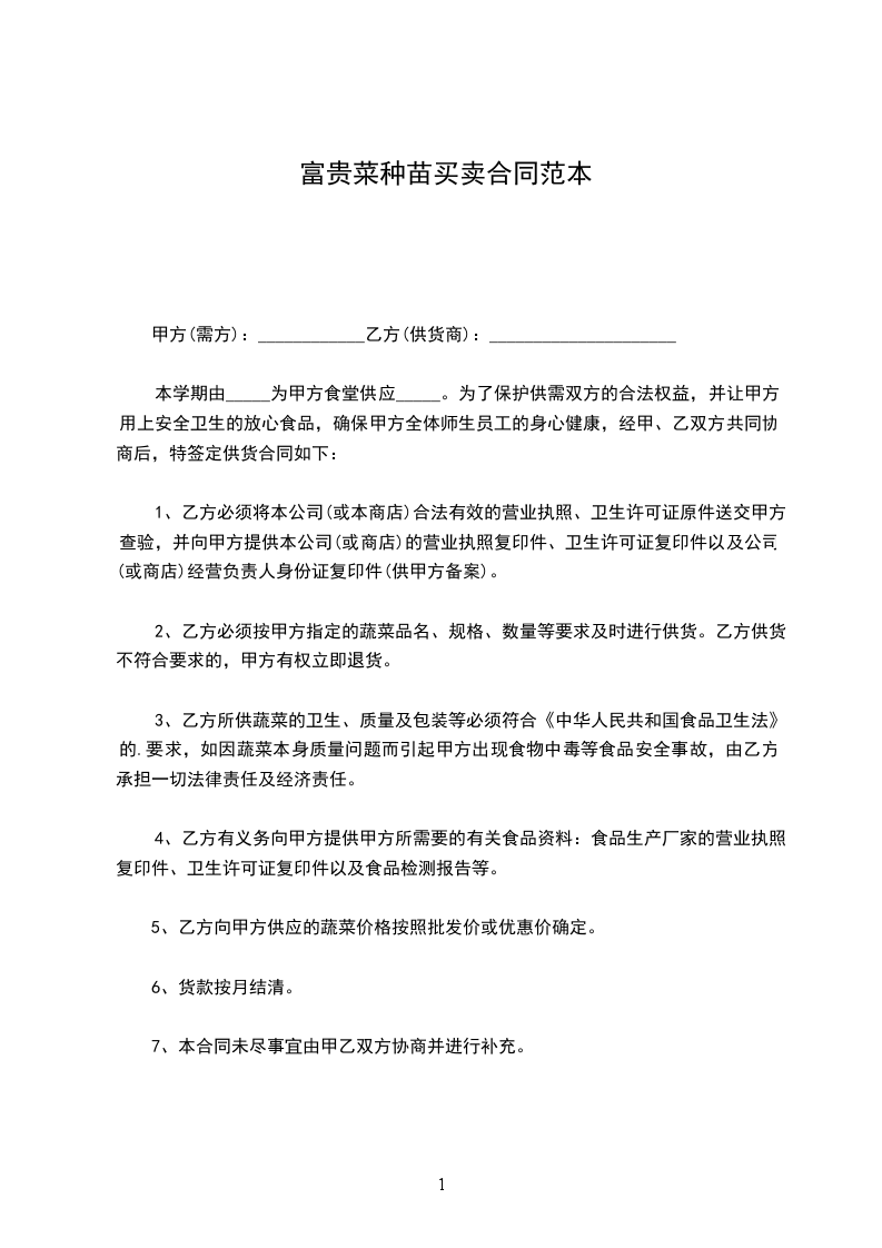 1.甲方对乙方交售的蔬菜必须及时验收,及时承付菜款,最迟不超过____小时(天)。(根据不同品种规定验收期限)