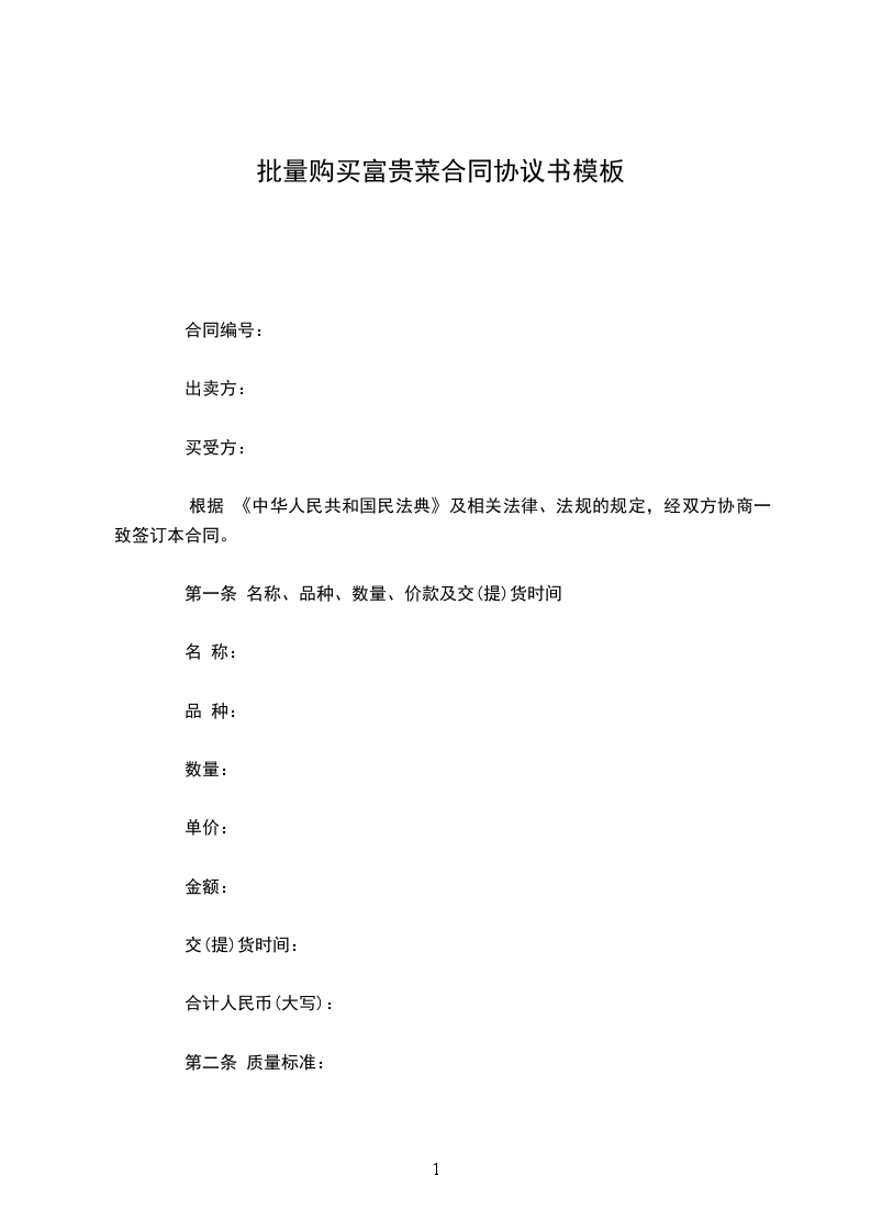 1.在正常或预约的临时收购时间内,甲方无故不收购,造成蔬菜变质和运输等损失,或故意压级压价,除应赔偿乙方的损失外,应向乙方偿付该批蔬菜总金额____%的违约金。