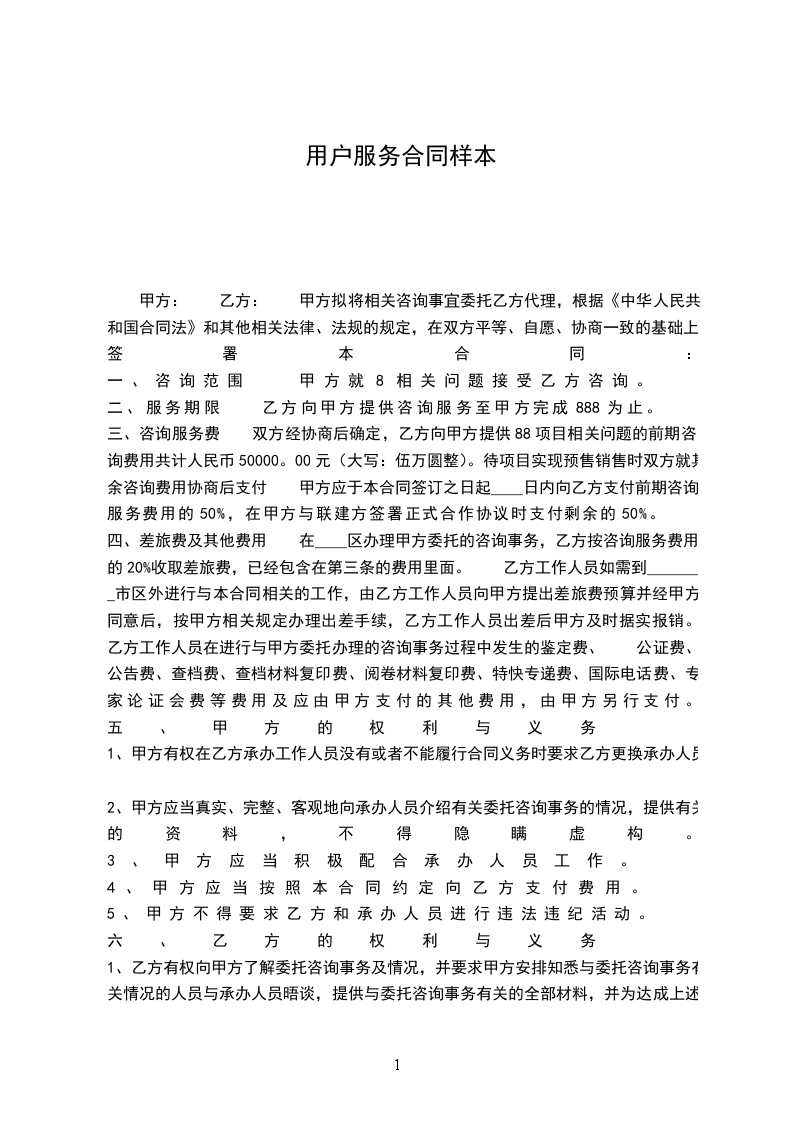 三、咨询服务费 双方经协商后确定,乙方向甲方提供88项目相关问题的前期咨询费用共计人民币50000。00元(大写:伍万圆整)。待项目实现预售销售时双方就其余咨询费用协商后支付 甲方应于本合同签订之日起____日内向乙方支付前期咨询服务费用的50%,在甲方与联建方签署正式合作协议时支付剩余的50%。