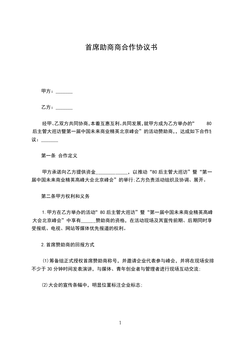 经甲、乙双方共同协商,本着互惠互利、共同发展,就甲方成为乙方举办的“80后主管大巡访暨第一届中国未来商业精英北京峰会”的活动赞助商,,达成如下合作协议: