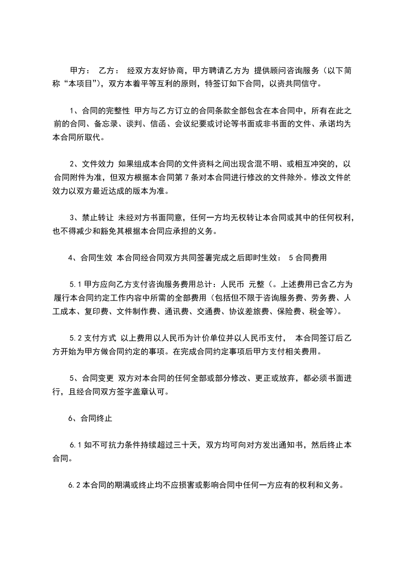 甲方: 乙方: 经双方友好协商,甲方聘请乙方为 提供顾问咨询服务(以下简称“本项目”),双方本着平等互利的原则,特签订如下合同,以资共同信守。