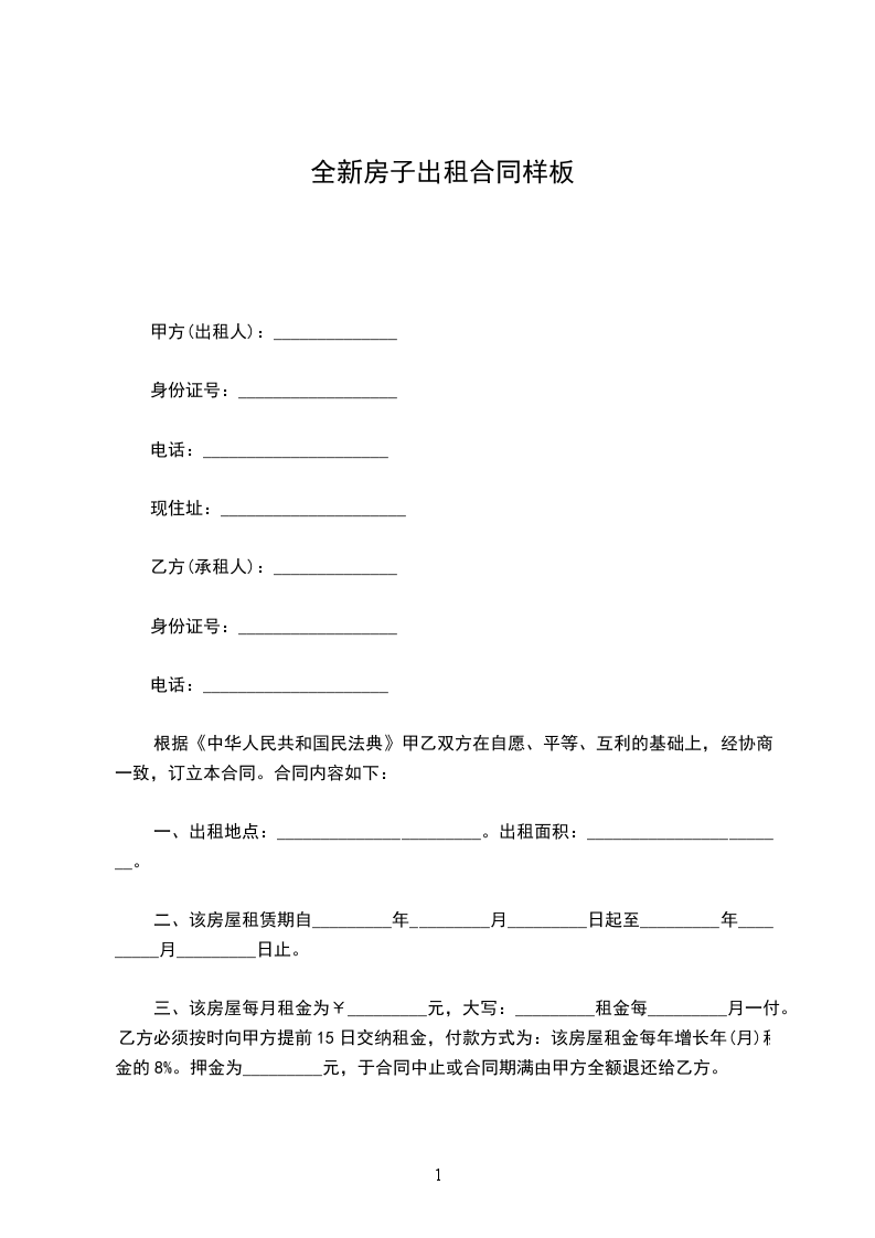 三、该房屋每月租金为¥_________元,大写:_________租金每_________月一付。乙方必须按时向甲方提前15日交纳租金,付款方式为:该房屋租金每年增长年(月)租金的8%。押金为_________元,于合同中止或合同期满由甲方全额退还给乙方。
