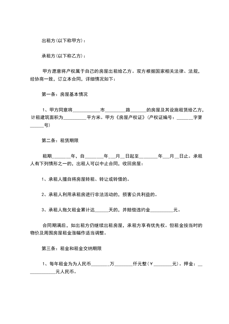 3、承租方违反合同,擅自将承租房屋转给他人使用的,应支付违约金_______元。如因此造成承租房屋损坏的,还应负责赔偿。