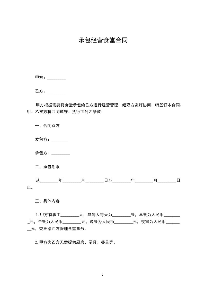 1、甲方有职工______人,其每人每天为______餐,早餐为人民币______元,午餐为人民币______元()晚餐为人民币______元(),夜宵为人民币______元,供给乙方办理伙食。