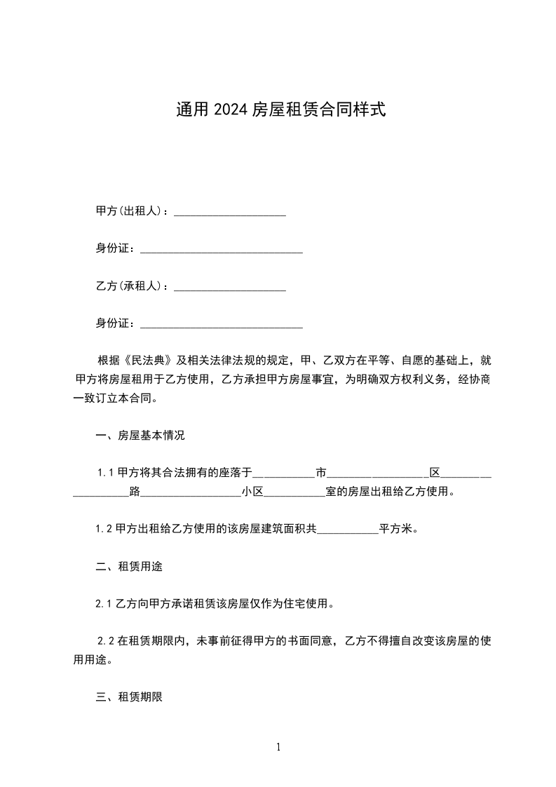 一、甲方将位于______小区______号楼______号的房屋出租给乙方居住使用,租赁期限自______年______月______日至______年______月______日,计______个月。
