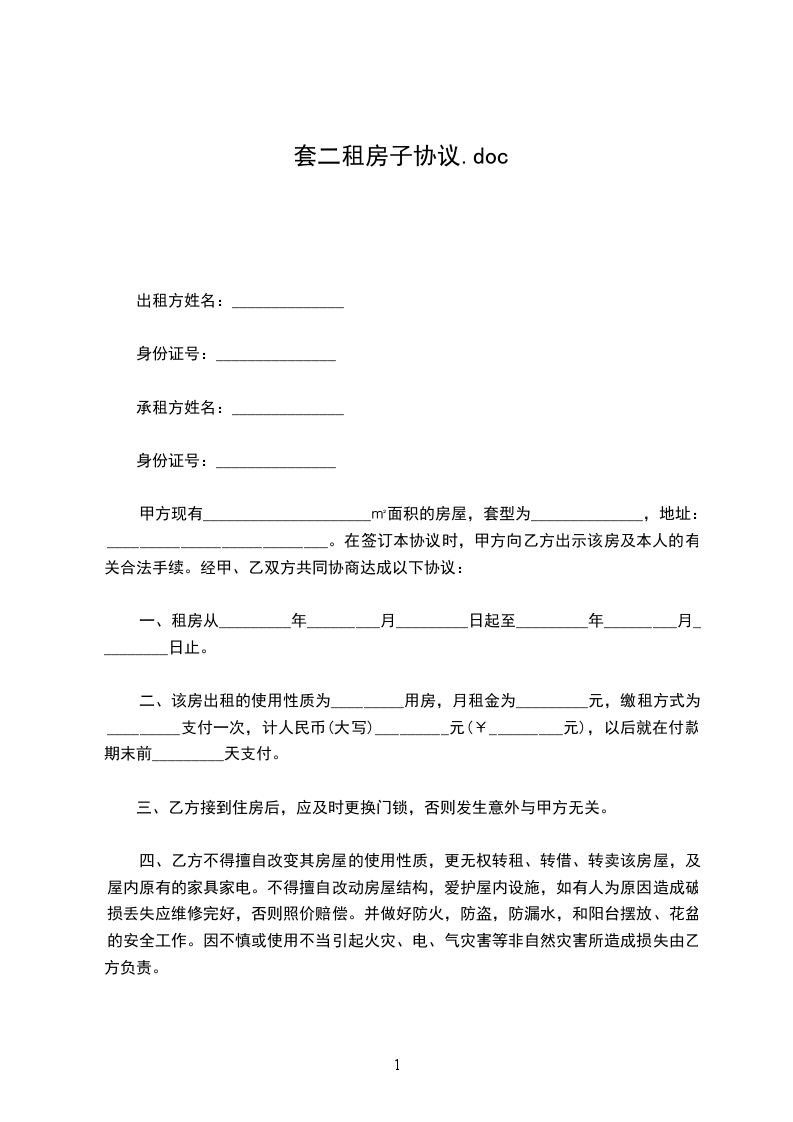 二、该房出租的使用性质为_________用房,月租金为_________元,缴租方式为_________支付一次,计人民币(大写)_________元(¥_________元),以后就在付款期末前_________天支付。