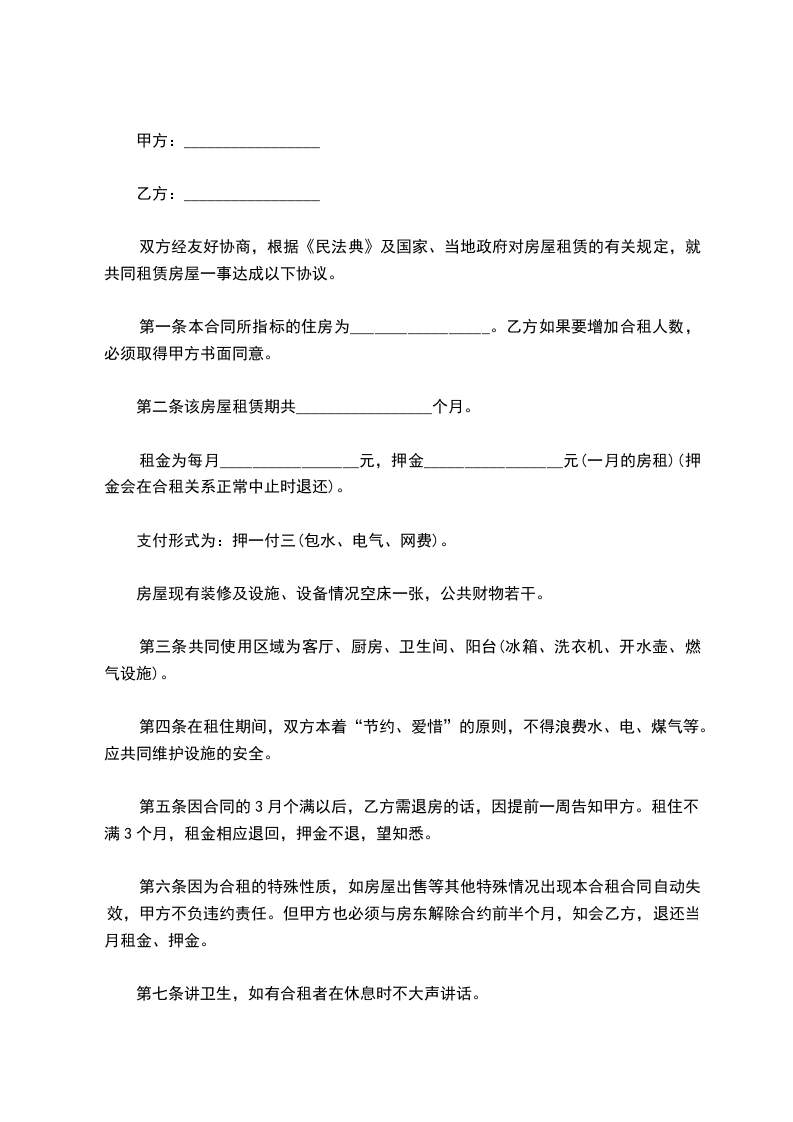 第一条本合同所指标的住房为_________________。乙方如果要增加合租人数,必须取得甲方书面同意。