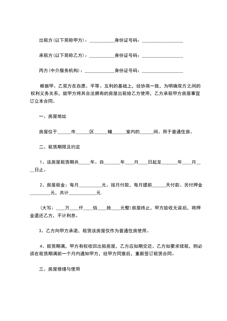 承租方(以下简称乙方):___________身份证号码:__________________