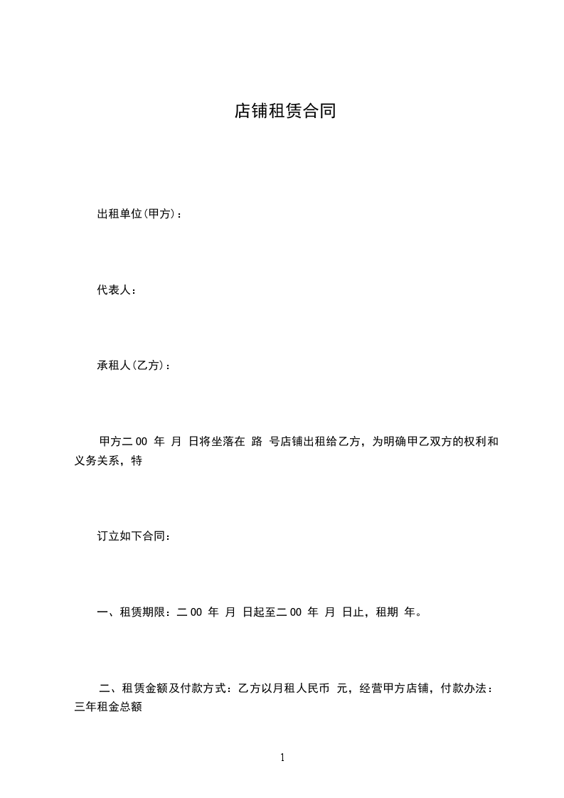 二、租赁金额及付款方式:乙方以月租人民币 元,经营甲方店铺,付款办法:三年租金总额