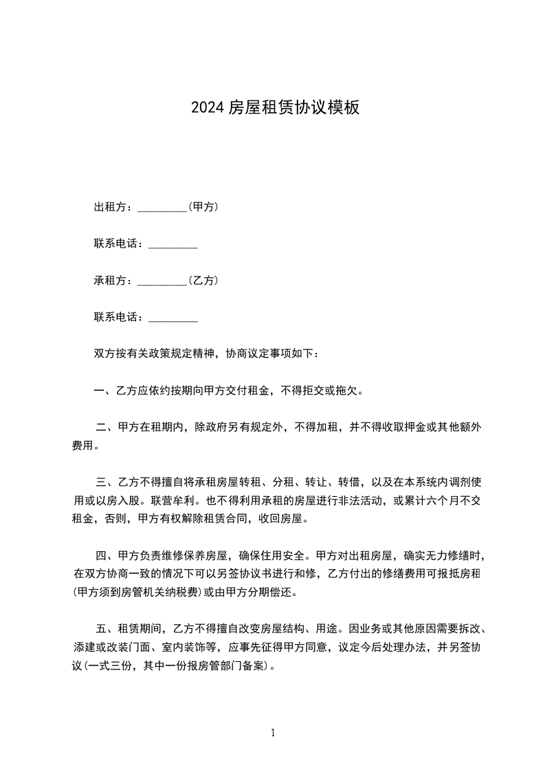 本房屋月租金为人民币______元,按月/季度/年结算。每月月初/每季季初/每年年______日内,乙方向甲方支付全月/季/年租金。