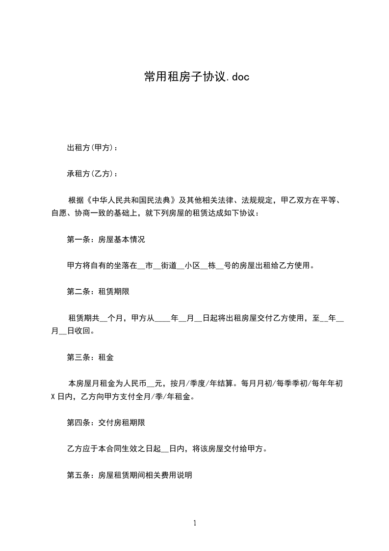 根据《中华人民共和国民法典》及其他相关法律、法规规定,甲乙双方在平等、自愿、协商一致的基础上,就下列房屋的租赁达成如下协议: