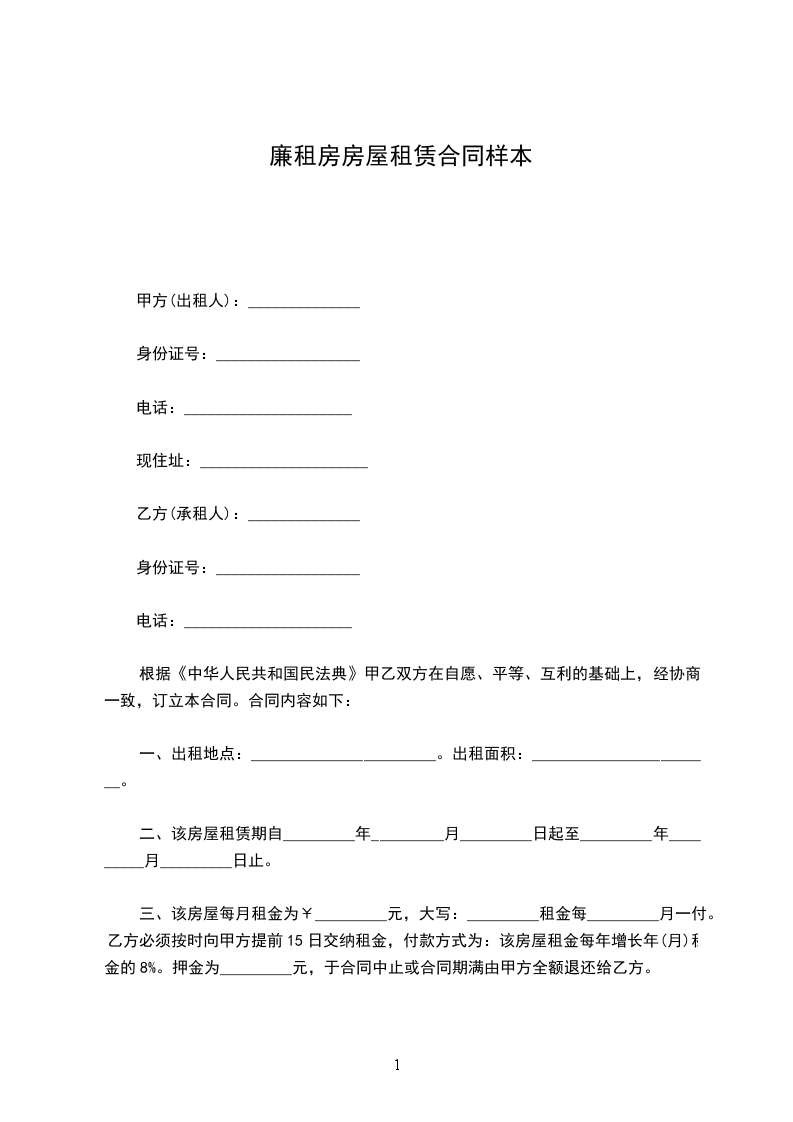 三、该房屋每月租金为¥_________元,大写:_________租金每_________月一付。乙方必须按时向甲方提前15日交纳租金,付款方式为:该房屋租金每年增长年(月)租金的8%。押金为_________元,于合同中止或合同期满由甲方全额退还给乙方。