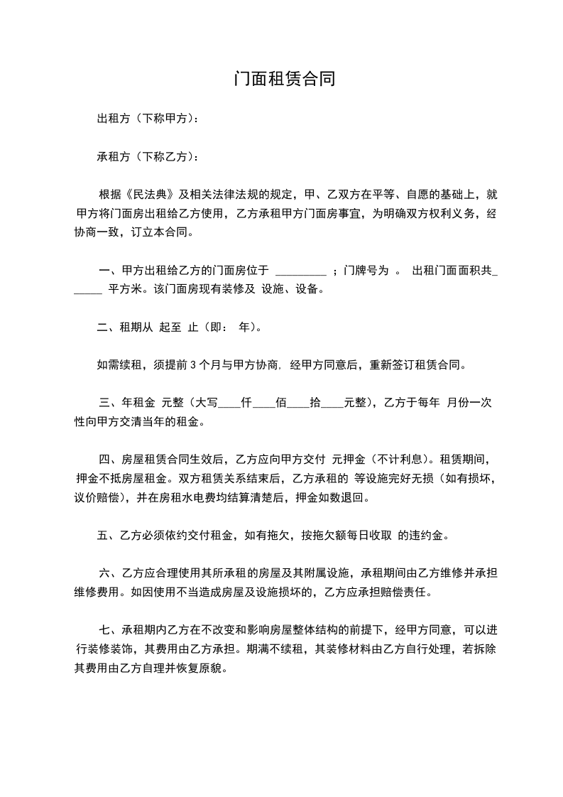 根据《民法典》及相关法律法规的规定,甲、乙双方在平等、自愿的基础上,就甲方将门面房出租给乙方使用,乙方承租甲方门面房事宜,为明确双方权利义务,经协商一致,订立本合同。