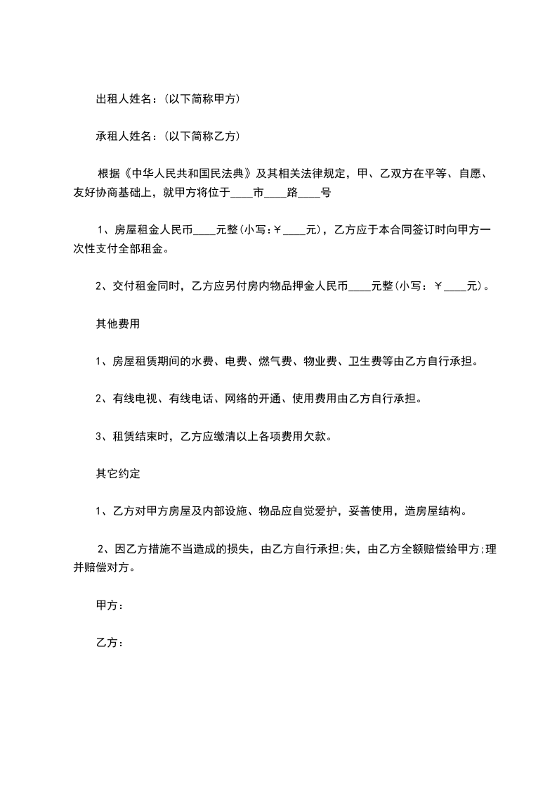 2、交付租金同时,乙方应另付房内物品押金人民币____元整(小写:¥____元)。