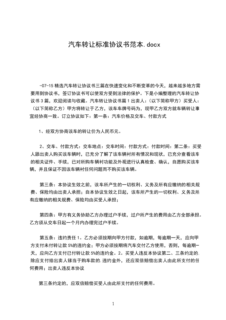 1。乙方必须按期向甲方付款,如逾期,每逾期一天,应向甲方支付未付转让款5%的违约金;甲方必须按期将汽车交付乙方使用,否则,每逾期一天,应向乙方支付已付转让款5%的违约金。